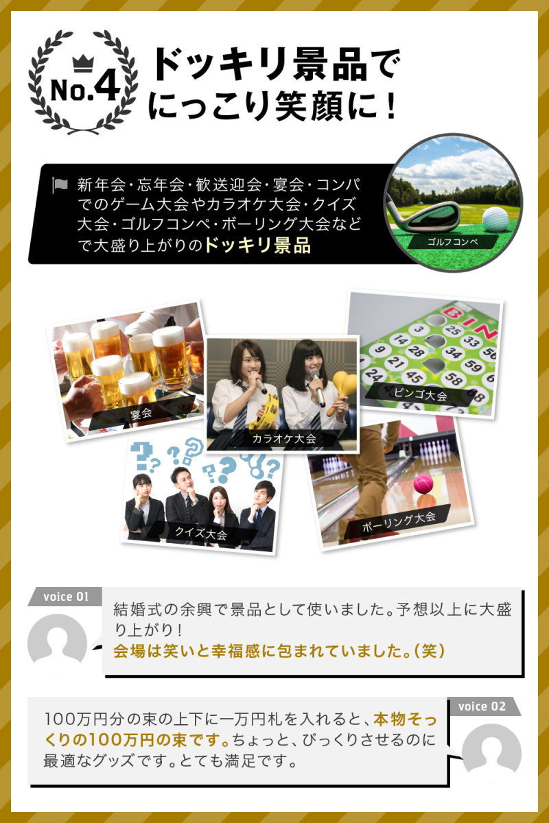 ★10束セットの大変お得な商品もあります★商品は、「ダミー用の100万円札束が2束(200万円分)」です。●商品説明・1万円札と同じサイズでクリーム色の無地の用紙です。・帯は銀行で使用している本物です。 (金融機関の文字の位置は札束ごとにバラバラとなっております。)※上記写真は、見本のため上に本物の1万円札を挟んでいます。ご使用時には、ご自分で本物の1万円札を入れてください。・1束は100枚です。●サイズ 1万円札と同じ(縦76mm×横160mm)●重さ 約93g※くれぐれも悪用なさらないようにお願い致します。★使用例・ドッキリとして家の机に置いておく・子どもや孫にお年玉、お小遣いとして渡してみてびっくりした顔を見る・SNS(インスタ、フェイスブック、ツイッター等)でお友達に自慢してみたりする・ギャンブル(パチンコ、スロット、競馬等)をする前にお祈りしてみる・宝くじと一緒に置いたりお財布に入れて金運アップ・お金を数える練習(画像、説明文の引用、転載は禁じます。)キーワード例100万円の札束 送料無料(メール便)大うけ!100万円札束 メモ帳 本物そっくりおもしろ雑貨 プレゼント 景品 小道具 たっぷり使えて実用的 1万円札 文房具メモ パーティーグッズ 種銭雑貨 百万円 メモ帳 送料込み 一万円札レプリカ 金運アップ グッズ100 万 入る 財布 札束メモ 札束 ダミー札束 メモ帳札束 数えるメモ札束レプリカ トランプ アタッシュケース 札束無情 おもちゃ札束 銃札 帯札束レプリカ 札束が入る長財布 札束の写真 札束入れ 札束 札束風呂札束 イラスト札束画像札束の夢 札束で殴る 札束ビンタ 英語札束 数え方札束 100万円札束100万円札束 ダミー 帯 1億円札 1億円で「安心」 老後1億円札 1億円貯める 父の日 母の日 早割 ギフト プレゼント お年玉 お年玉袋 ポチ袋 高額 ドッキリ 面白い おもしろい 忘年会 新年会 出し物 ゴルフコンペ 景品 楽天1位 札束風呂 宴会 余興 忘年会景品