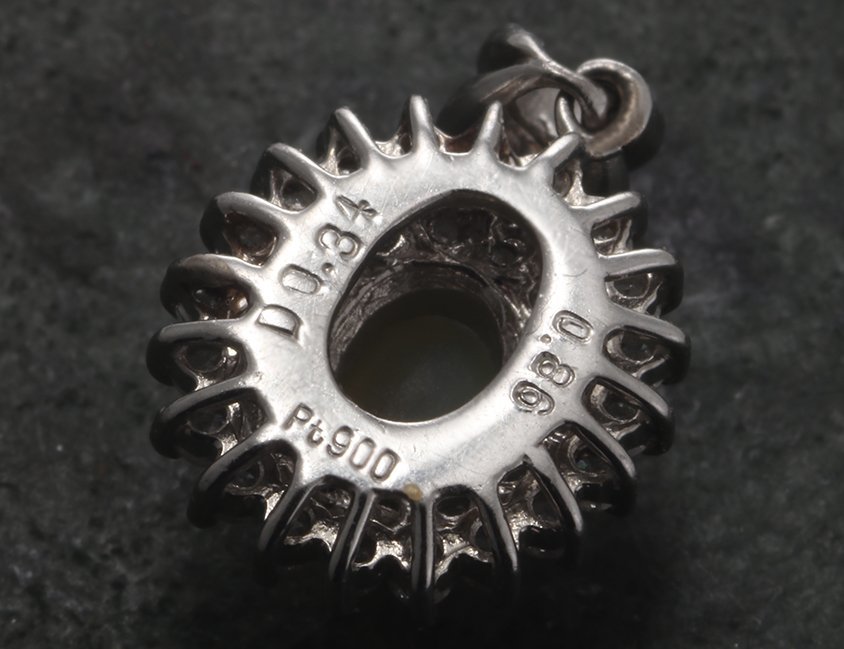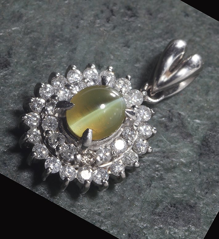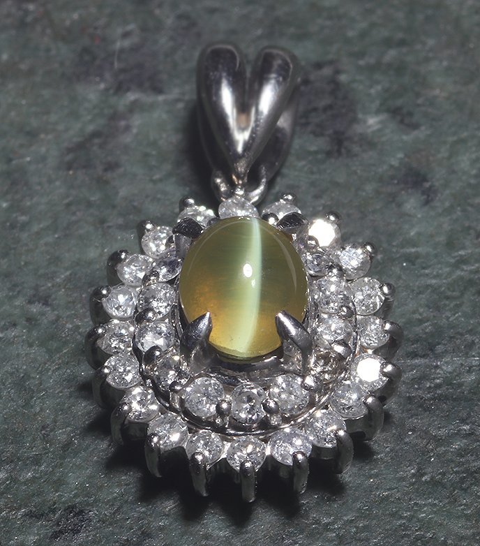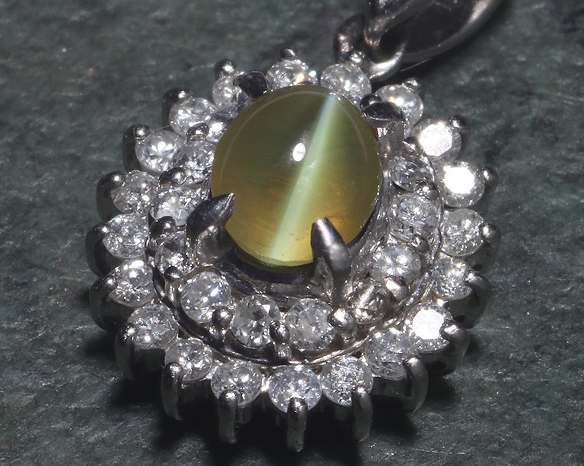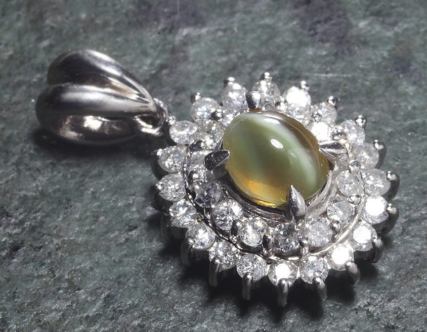 | コメント | [[全ての商品に品質保証カードが付きますのでご安心ください]] 綺麗なキャッツアイ効果が見られる、天然クリソベリルです。5.7x4.7のとても小さいものですが、ダイアの頂点にしっかりした存在感を示しています。ダイアは合計で0.34カラットの刻印があります。バチカンの内径が3.8X2.4ミリと狭いので通常のネックレスは通らないことがありますので、ご注意ください。 |