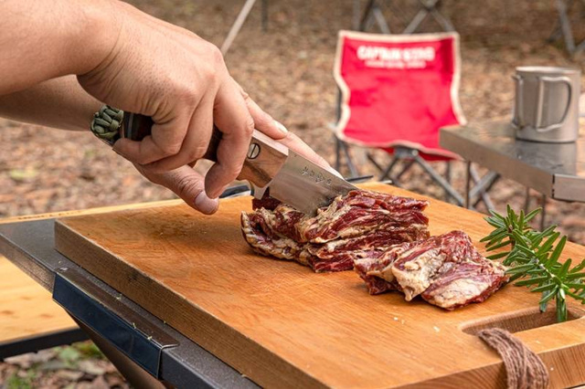 ・3層構造の特注鋼材は、厚み4.8㎜あり、斧や鉈に近いあら使いや、バトニング(薪割り)の衝撃にも耐えるように設計。また、刃先から柄まで一体の鋼材を使用して強度を確保しています。