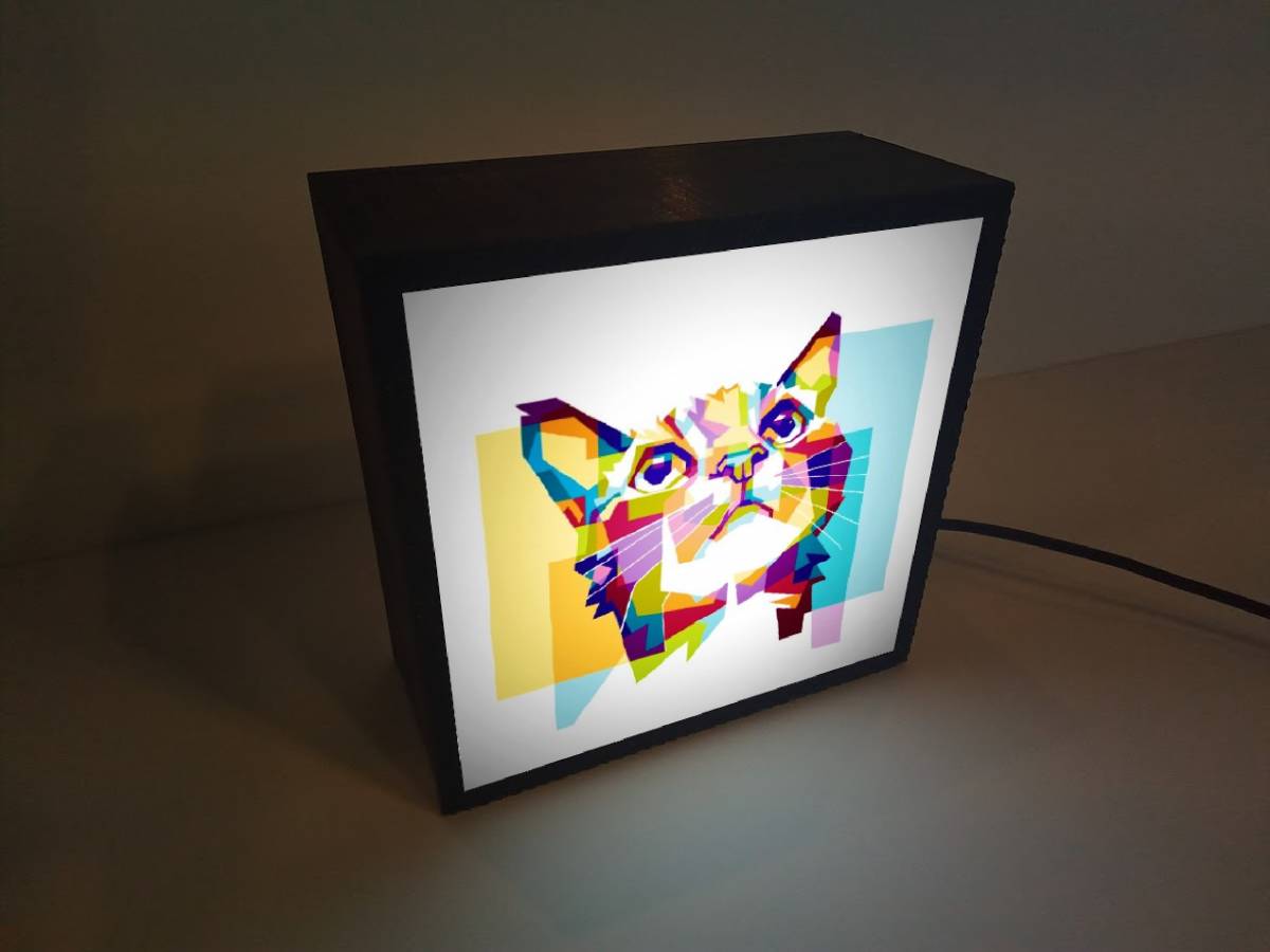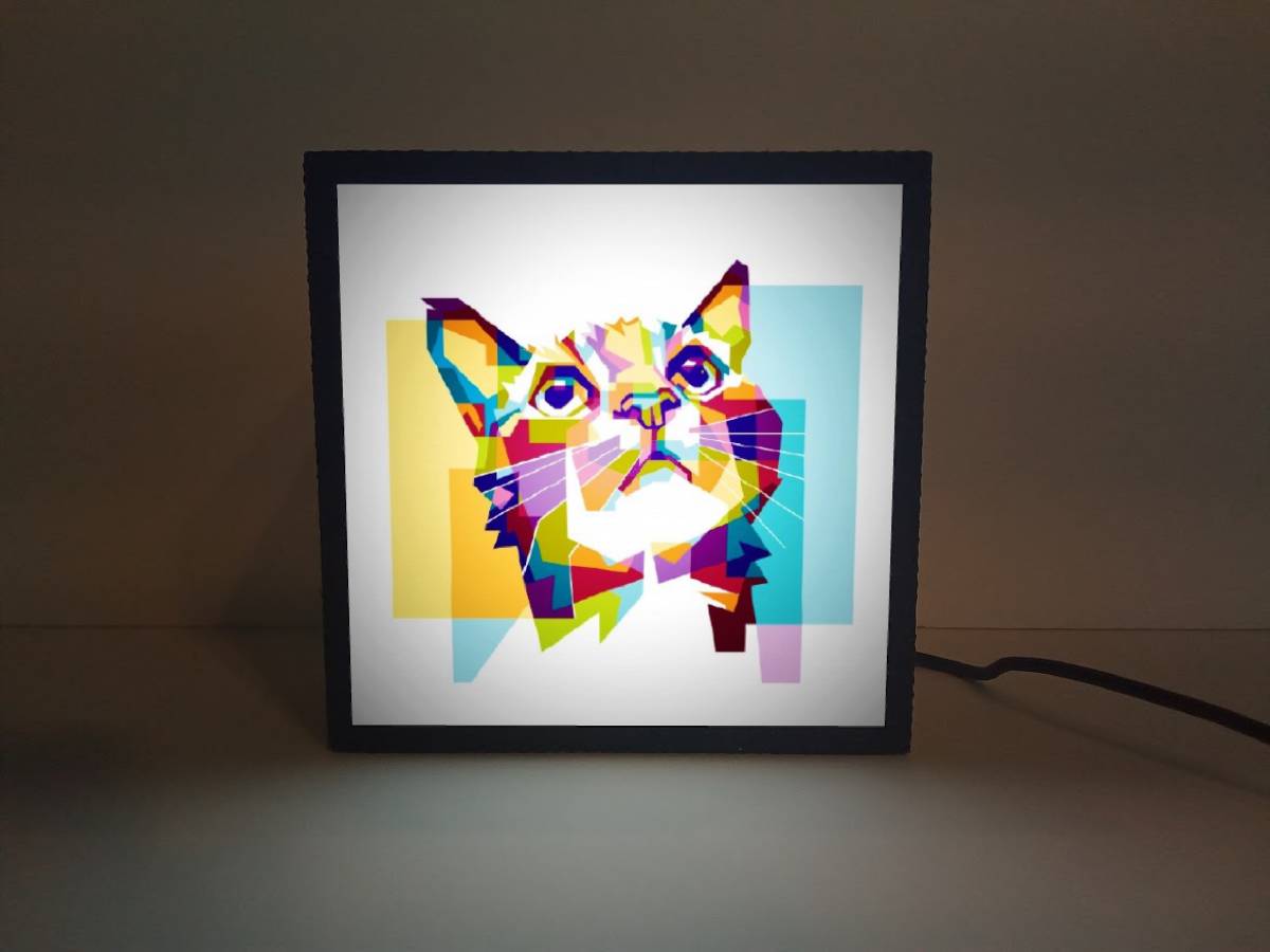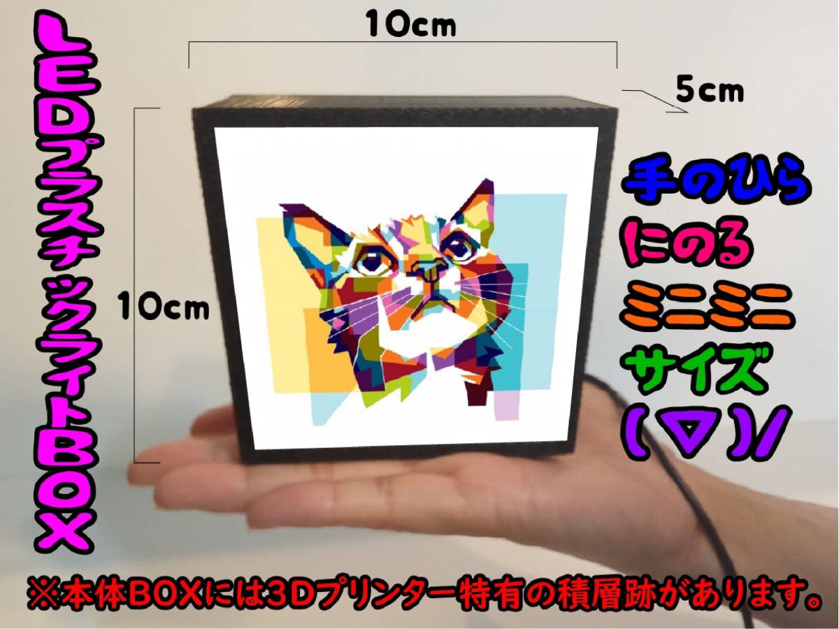 ★LEDプラスチックライトBOXの10センチ角真四角ミニミニサイズ★ USB12Vジャック・付属アダプターでも光る2通りの電源使用可能なコンパクト看板ライトBOXです。 ■本体材質:3Dプリンター造形プラスチック(PLA)・表示面(IJバックライト印刷発光フィルム)屋外看板に基づいた施工(本品屋内仕様) ■サイズ:縦10センチ×横10センチ×奥行き5センチでコンパクトサイズ 電源コード約1mで直結になっておりますので、スイッチが必要な方は、市販のUSB対応ON/OFFスイッチ付延長コードをご利用下さい(別売り※付属されません) 3Dプリンターで造形、とても軽量・コンパクトですので邪魔にならず、店舗・お部屋・ガレージ・書斎のテーブルやちょっとした場所にと多様に対応できる本体となっております。                 卓上を賑やかに明るく・・話題のネタに・・プレゼントなどに最適です。 ※本体は3Dプリンター特有の造形積層跡があります。検品は行っておりますので、製作過程の多少の傷は予めご了承下さい。その都度、完全受注生産ですのでご購入後のお客様ご都合キャンセルはできません。不良品に関しては、交換・返金対応しておりますので宜しくお願い致します。 ※電池式に変更(電池BOX付属)もできます。大きいサイズご希望などございましたらコメントお待ちしております。 自社製造製品 ペットショップ 猫 ネコ ねこ にゃんこ 飼い猫 ペット 猫カフェ バー ミニチュア 看板 サイン ライト 雑貨 インテリア雑貨 置物 ランプ