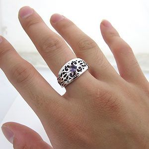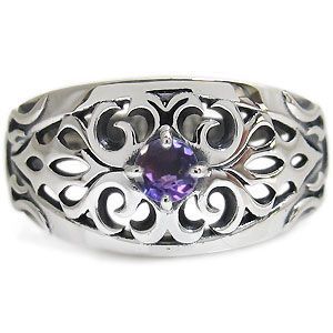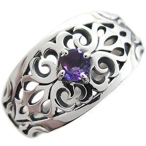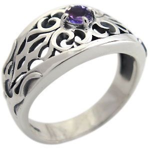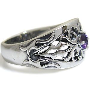 2月誕生石アメジストを一粒使用した、トライバルデザインのシルバー製メンズリング(指輪)です。