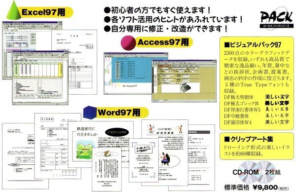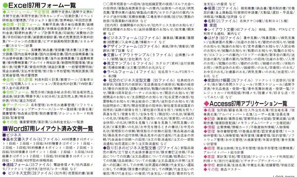 ワードやエクセルのフォーム集、グラフィックデータ、フォント、クリップアート集などが収録された「まるごとパック」です。