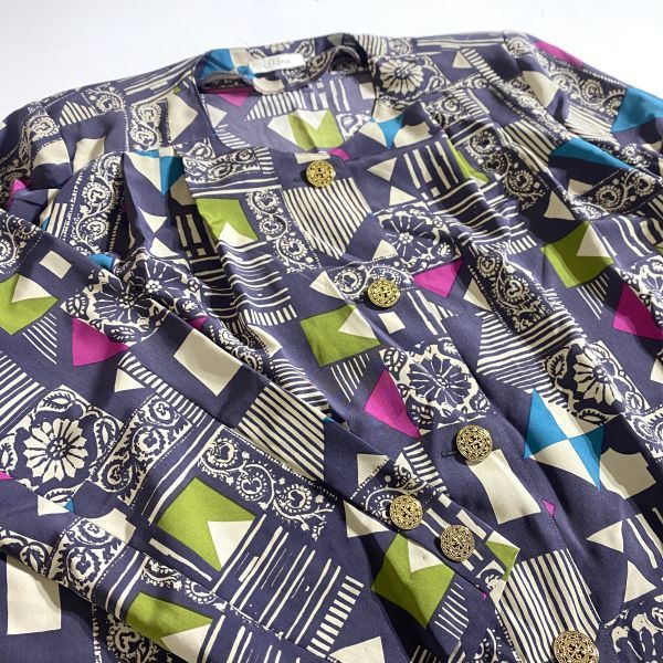 90s 総柄シャツ ノーカラーシャツ ブラウス チュニック サイズ9~11 古着 レトロ 金ボタン ポリシャツ 日本製 匿名配送