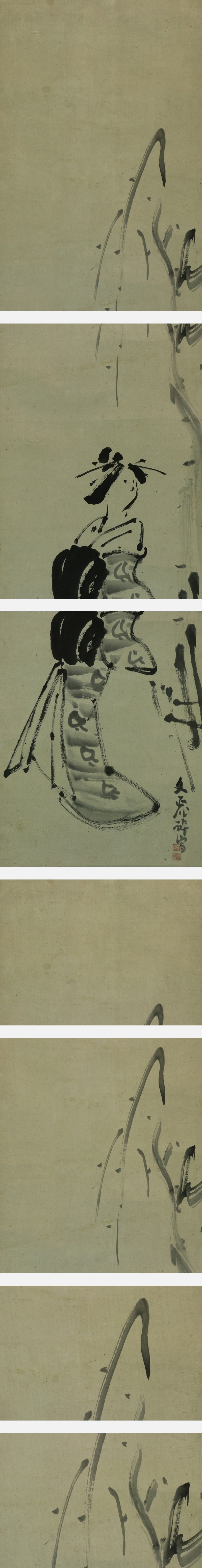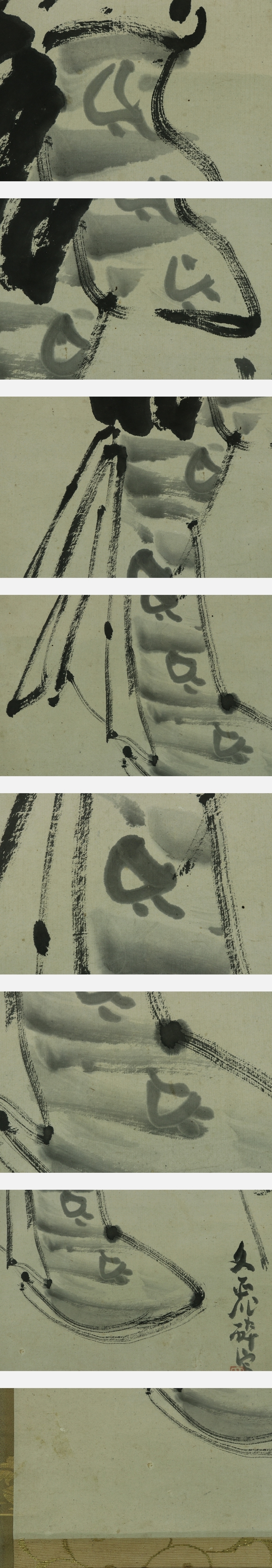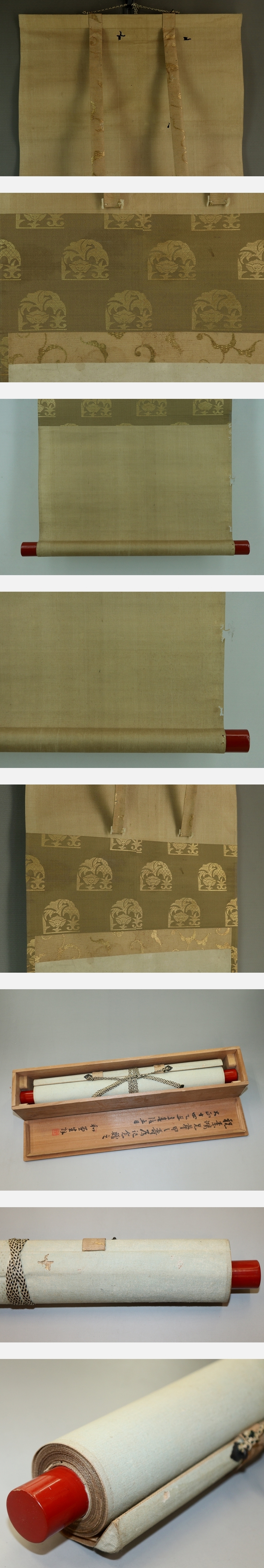 甲賀文麗 こうが-ぶんれい(?-1839) 江戸時代後期の画家。 京都の人。村上東洲に学び,山水花鳥を描いた。 天保10年1月22日死去。名は璃。別号に百錬,百錬堂。 本紙は、染み、汚れ、強い折れ、皺、虫食いがあります。 表装は、染み、汚れ、折れ、皺、虫食い、破れ、ほつれ、くすみ、箱に破損があります。 【サイズ】 作品 横約30cm×縦約110cm 表装 横約32.5cm×縦約196cm |