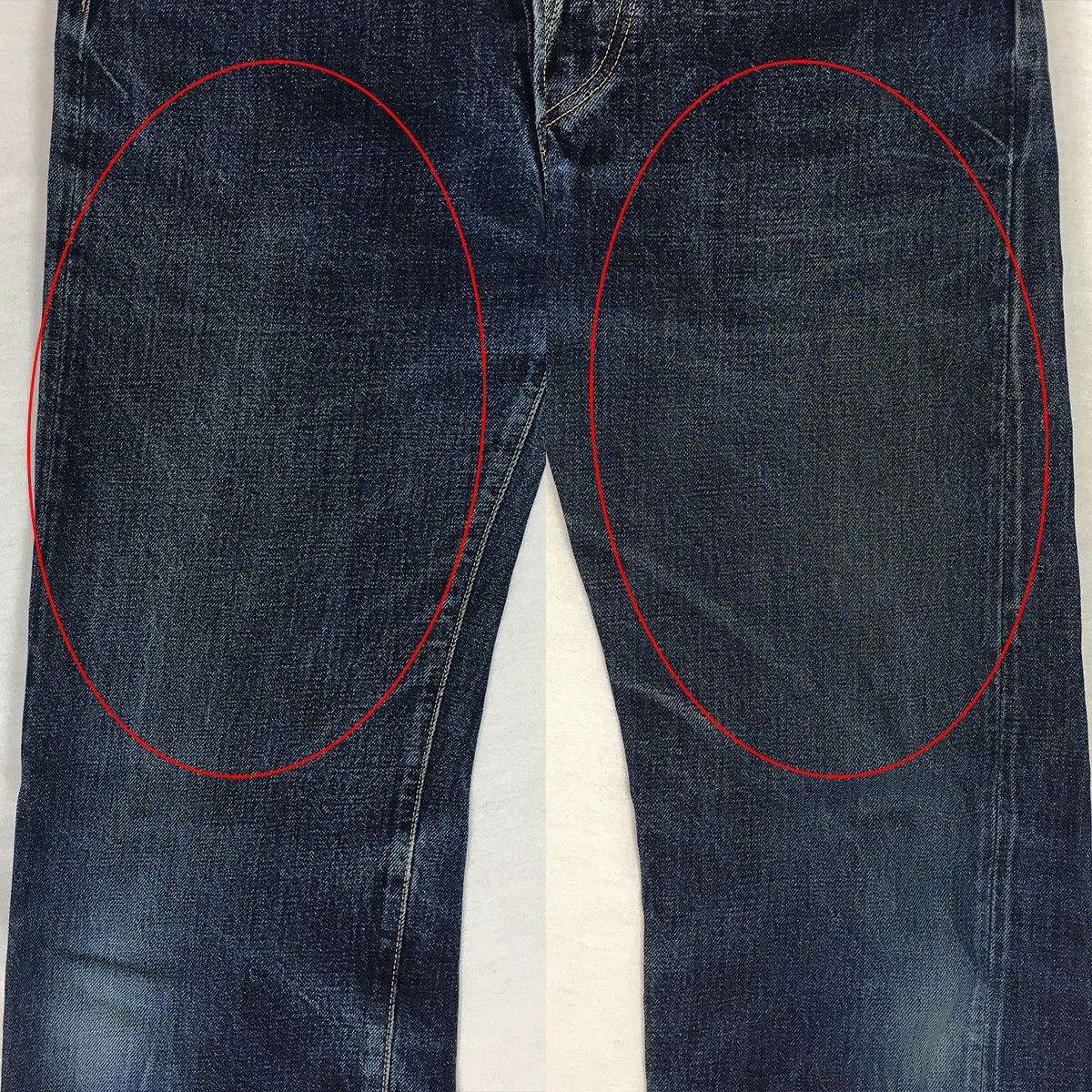 正面両太ももが着用に伴いややくすんだ感じの色合いです。