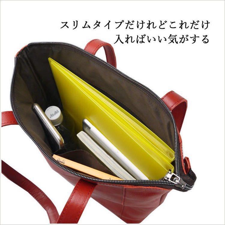 縦型のシンプルなレザートートバッグ。薄マチで掛けやすくファスナー開閉で機能的。