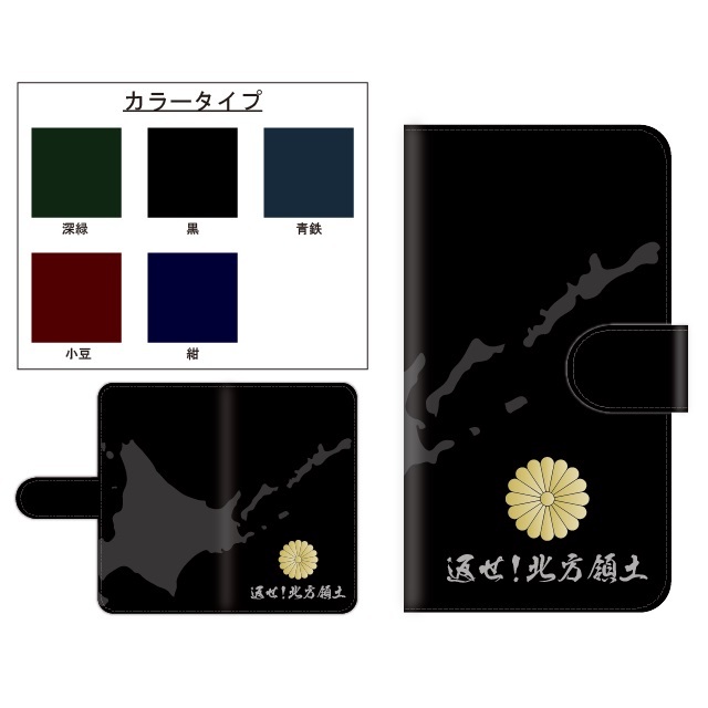 ・北方四島・返せ北方領土の文字と菊の紋を印刷した手帳型のスマホケースです。
