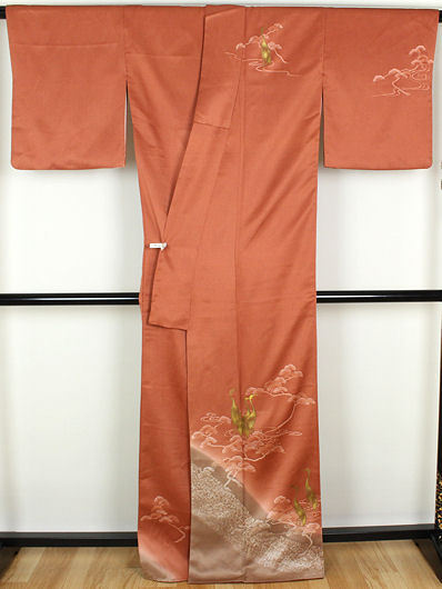 | 色・柄 | 訪問着 袷 丹後縮緬地 赤茶・オーク暈し地松に金箔焼き加工鶴 竹屋町ししゅう鶴 172 広襟 一つ紋 しつけ付き (写真では上手く色が出ない場合があります。ご了承下さい) |