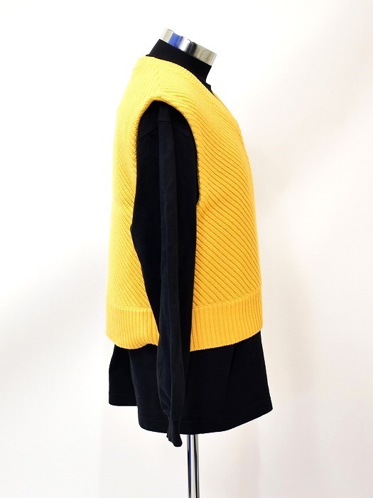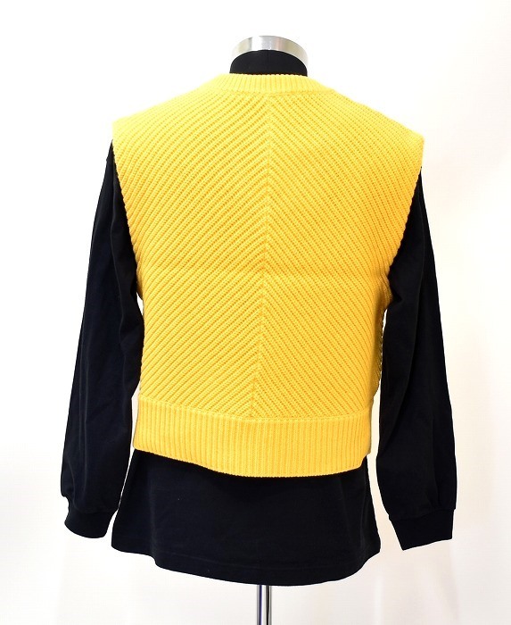 ・素材:ウール70%アクリル30% ・カラー:イエロー ・サイズ:L 実寸 肩幅 約45cm・身幅 約49.5cm・襟下から着丈 約53cm(多少の誤差はお許しください) 膨らみのあるアクリル混ウール糸5ゲージを使用したニットベスト。 表情豊かな あぜ 感 を感じるリブ編みで、短めの着丈がポイントです。 色々なレイヤードスタイルが楽しめ、着こなしのアクセントとなります。 新品 定価¥24200(税込) かなりお値打ちだと思います。この機会にぜひ!。 他にもいろいろ出品しています。 管理番号:082211MY-088750 ★ PD042501-1000 |