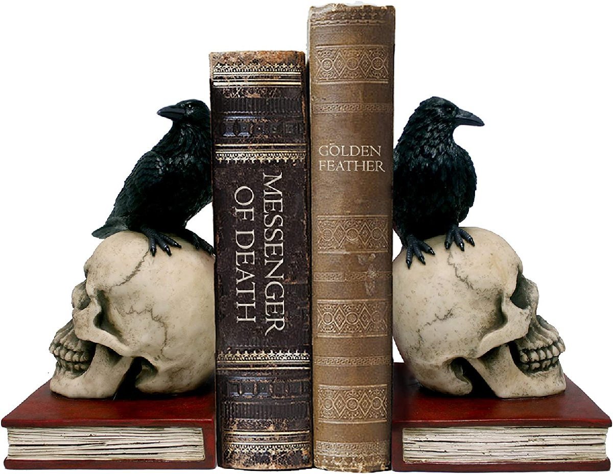 殺人とミステリー - ワタリカラスが乗った、スカル頭蓋骨 ブックエンド  ゴシック 読書本棚 図書館(輸入品