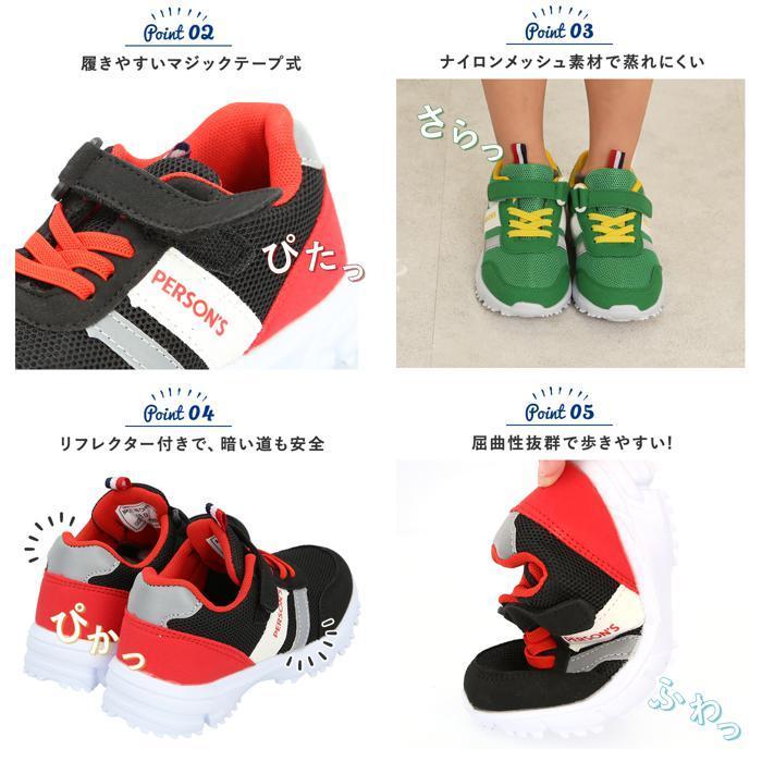 | 商品説明 | ・軽量で足が疲れにくく履きやすい!PERSONSのマジックテープ式のキッズスニーカーが新登場。 ・アッパー部分はナイロンメッシュ素材を使用しているので、足が蒸れにくく快適に履ける。 ・かかとの後ろや両サイドにリフレクター(反射板)を採用!夜間の車や自転車のライトを反射して、お子さまの安全を守ってくれる。 ・柔らかいソールを使用しているので、屈曲性が抜群で正しい歩行をサポートしてくれる。 ・中敷きが取り外し可能なので、洗いやすくいつでも清潔を保てる。 ・ベロ部分のトリコロールカラーがオシャレポイント♪ ・保育園・幼稚園で毎日大活躍! |