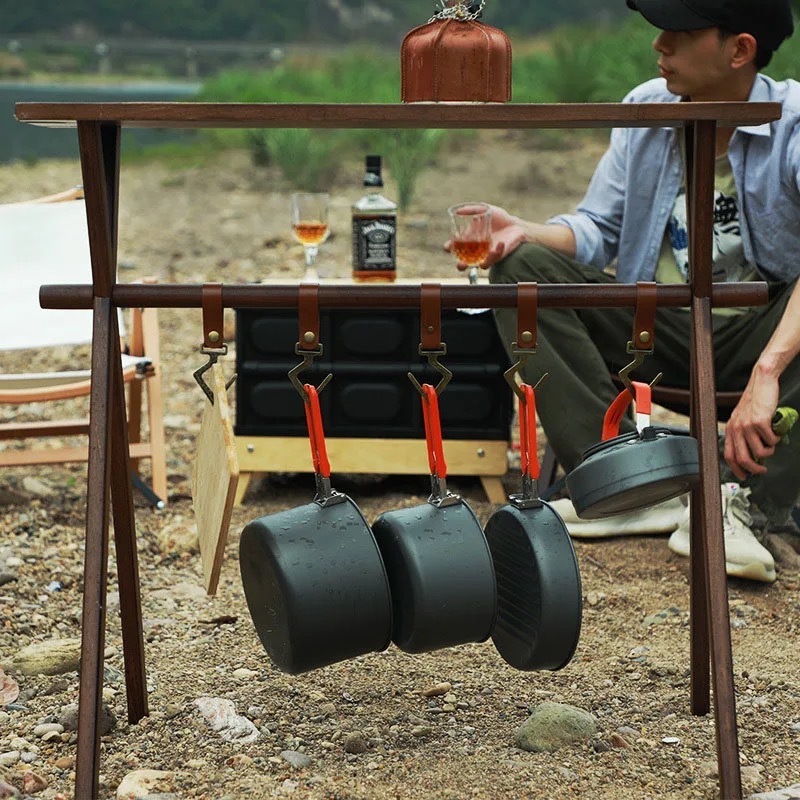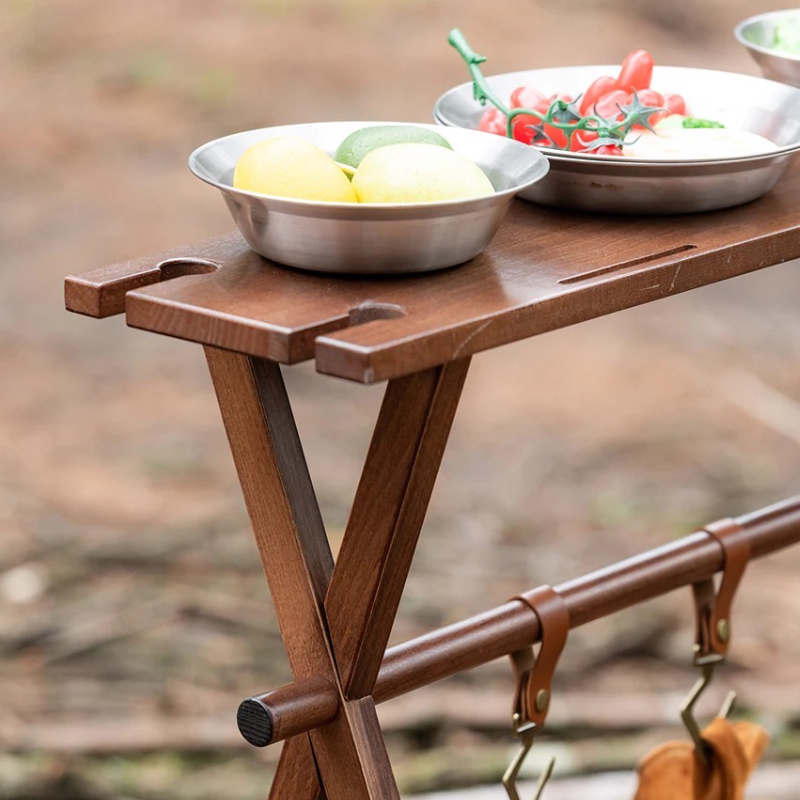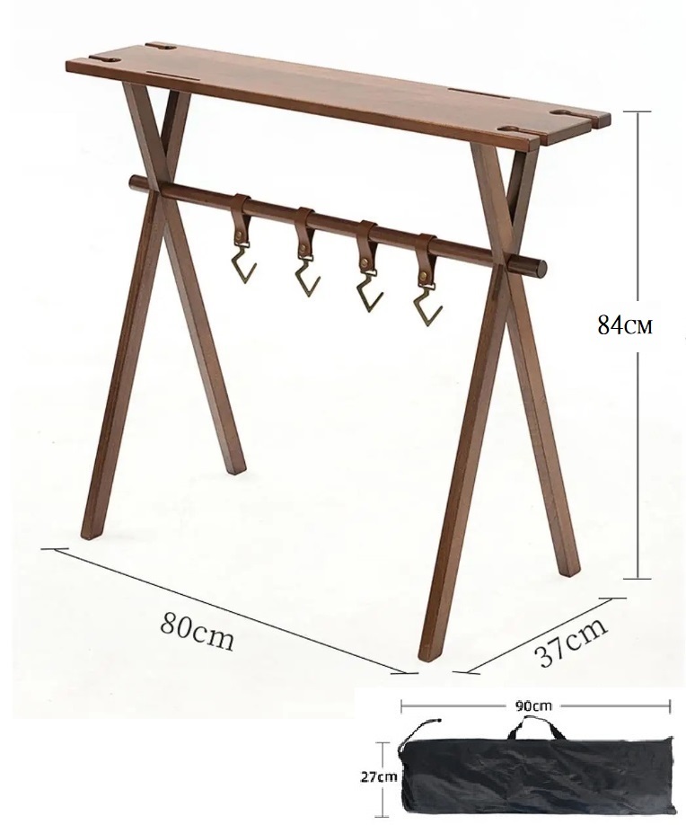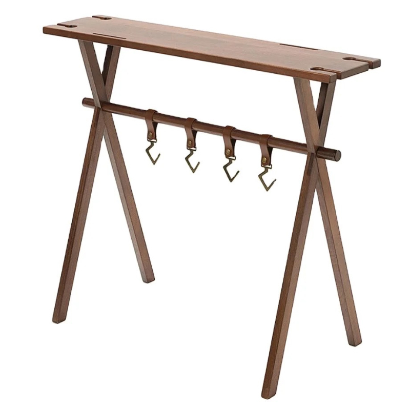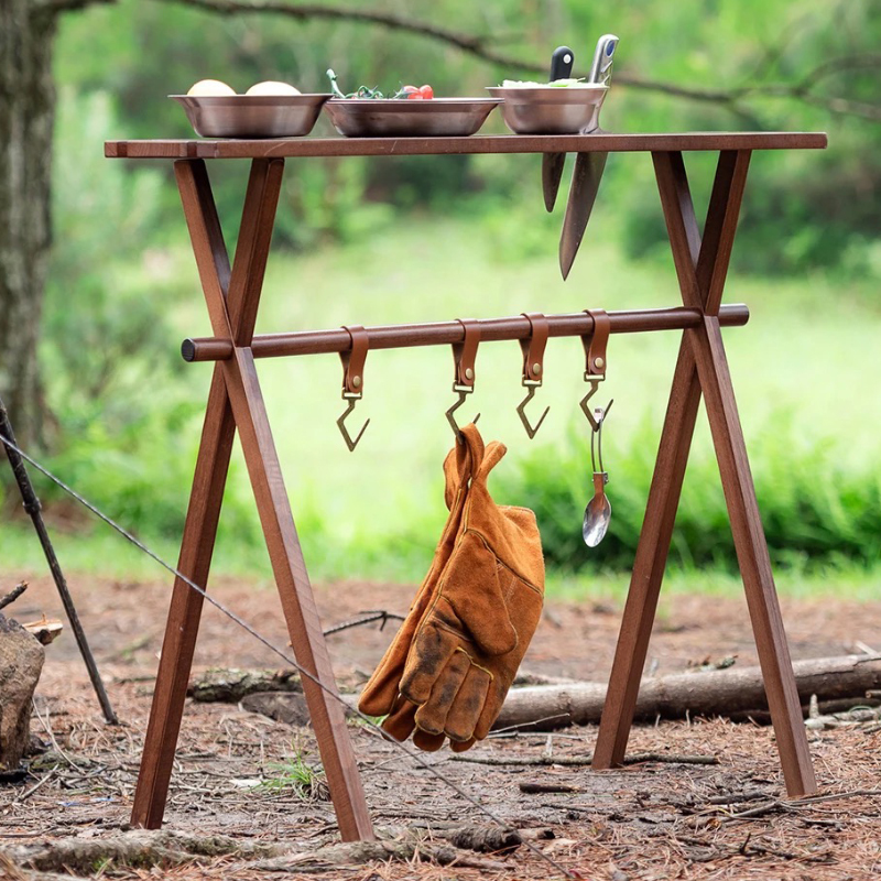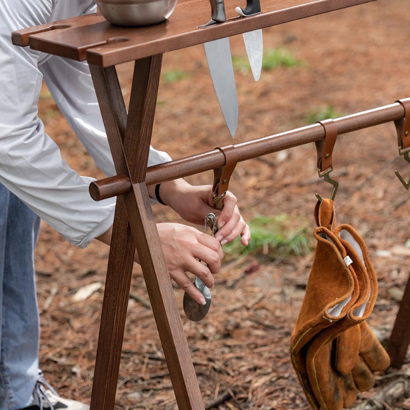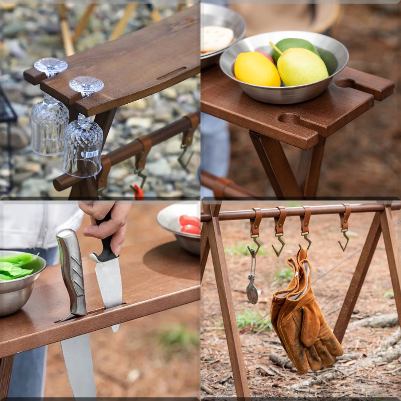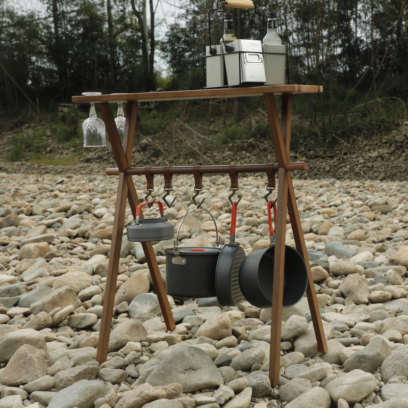 | ★こちらは組み立て式の木製ハンギングラックの登場です。ハンギングラックにテーブル天板が付いており、テーブルとラックの2WAYで使用する事ができる便利でおしゃれなアイテムです。組立て式フレームでコンパクトに収納可能。アウトドアはもちろん、インドアにもオススメなアイテム。 ★テーブル天板とラックが一体となって2WAYで使うことができます。テーブルの高さは84cmあり、キッチンテーブルと同じぐらいの高さがありますから、キッチン周りの小物置きや、カウンターテーブルのような使い方も良いでしょう。 ★レザーフックが5点付属しておりキッチン小物や、焚き火周りのギアを吊るすのに最適です。グラススタンド用の切り込みがありますのでとても便利です。 またテーブル上部には包丁やハサミなどの調理器具を差しておける切り込みが2箇所開いております。 ★簡単に組み立てることが出来る組み立て式で、屋内・屋外などの持ち運びが簡単で、収納もコンパクトです。付属の収納ケースに入れて収納・持ち運びが可能となっています。 ①無垢材で、耐荷重が10kgまで耐えられ、耐久性を気にする必要はないです ②良い安定性を提供し、強風が吹いても倒れない ③椅子に座って、ちょうどいい高さで使うのにぴったり ④収納もコンパクトで、キャンプ用品などと一緒にテントの収納袋に全部入ります ⑤初心者にしても組み立てが簡単! ⑥手元の取り回しと小物のレイアウトを快適にするアイテム ⑦アウトドア活動の時にキッチン用品、雑物の整理などに役立つ | |||