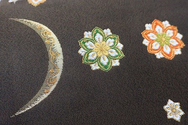 【送料無料】 袋帯 茶色 三日月 花紋 唐花 横縞 里山 花 小花 金糸 正絹 洒落袋帯 おしゃれ 着物 仕立て上がり m-4205 |