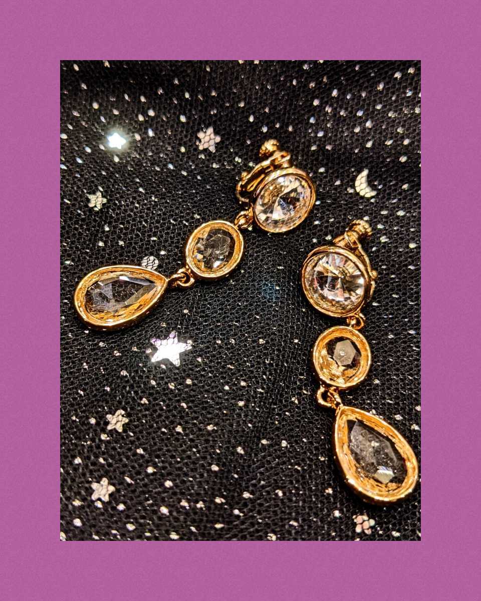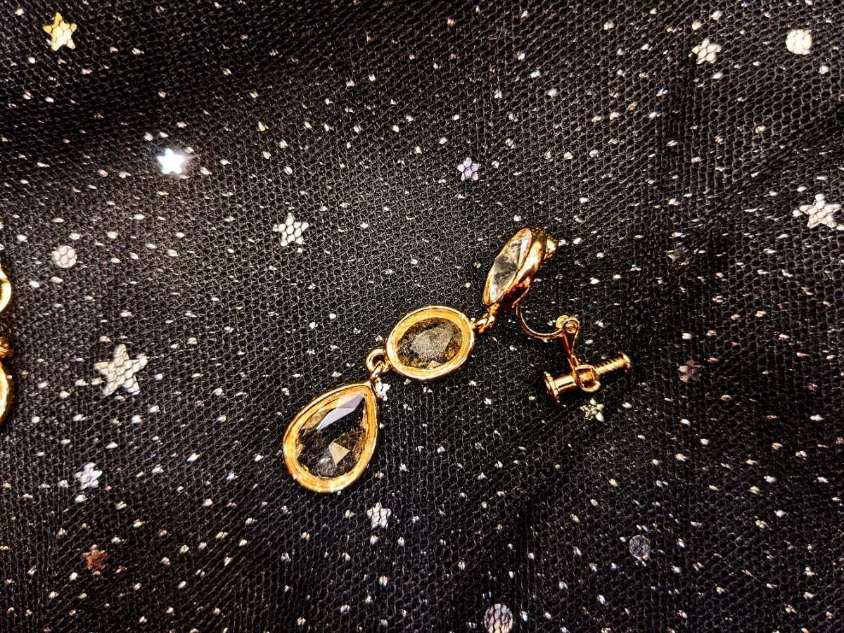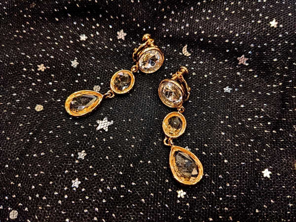 三連のビジューが揺れるアンティーク感のあるかわいらしいイヤリングです。