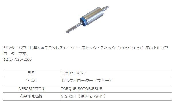 川田模型のラジコンカー用ブラシレスモーター部品。(新品) サンダーパワー社、Z3Rブラシレスモーター、ストック スペック (10.5-21.5T)用です。 トルク型のスペアローター。 型番: TPMR540AST サイズ: 12.2/7.25/25.0 新品ですが外パッケージに保管傷、値札シール跡有り。 新品の為、ノークレームで宜しい方のみ入札願います。 落札金額+送料を御負担下さい。 (管理番号:809-40L) |