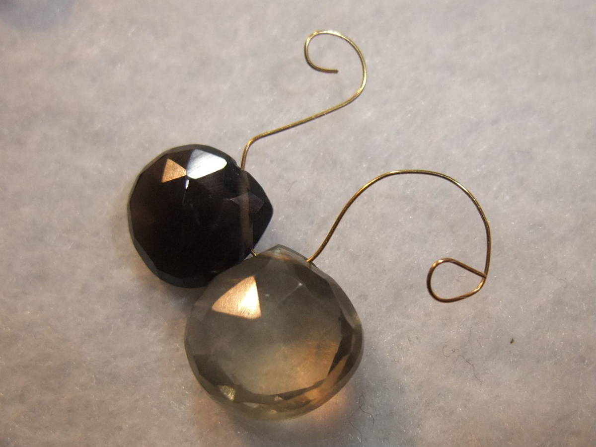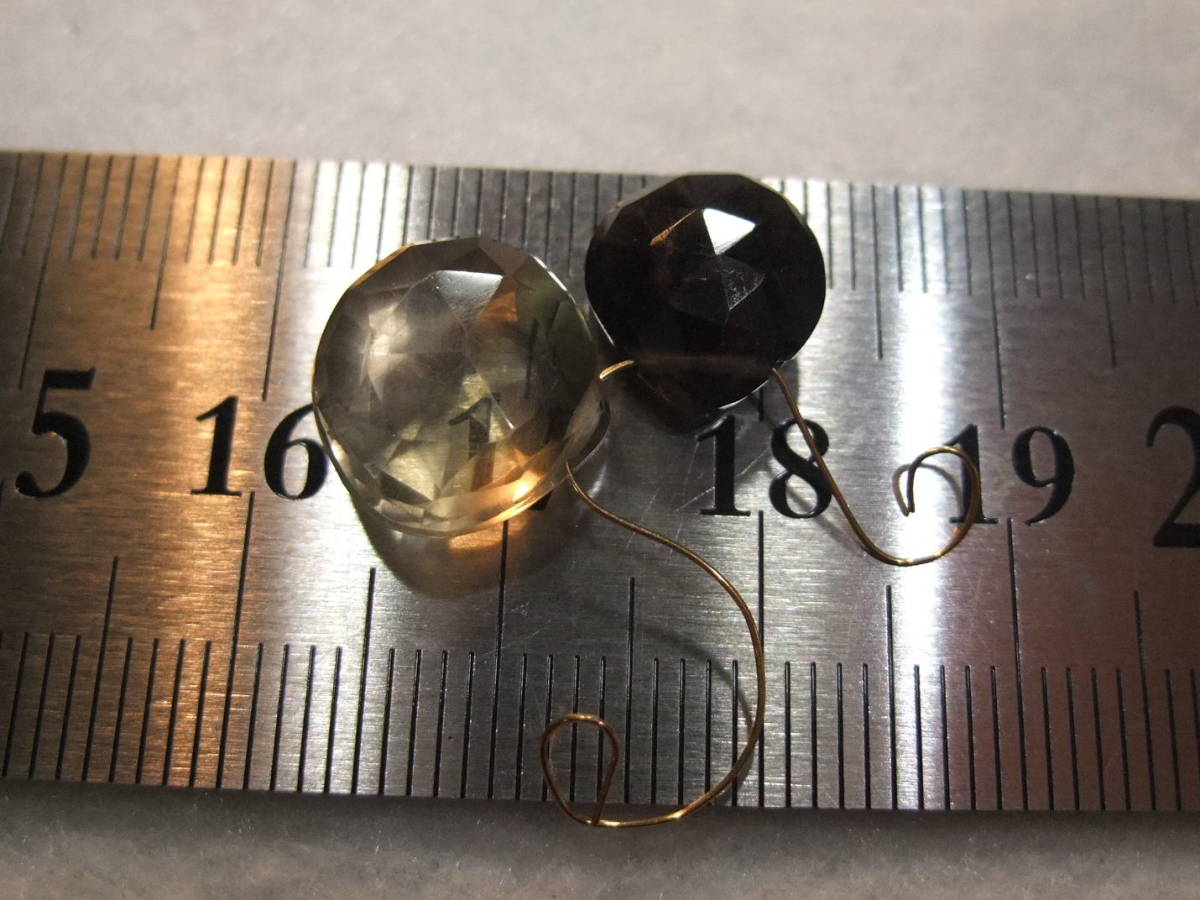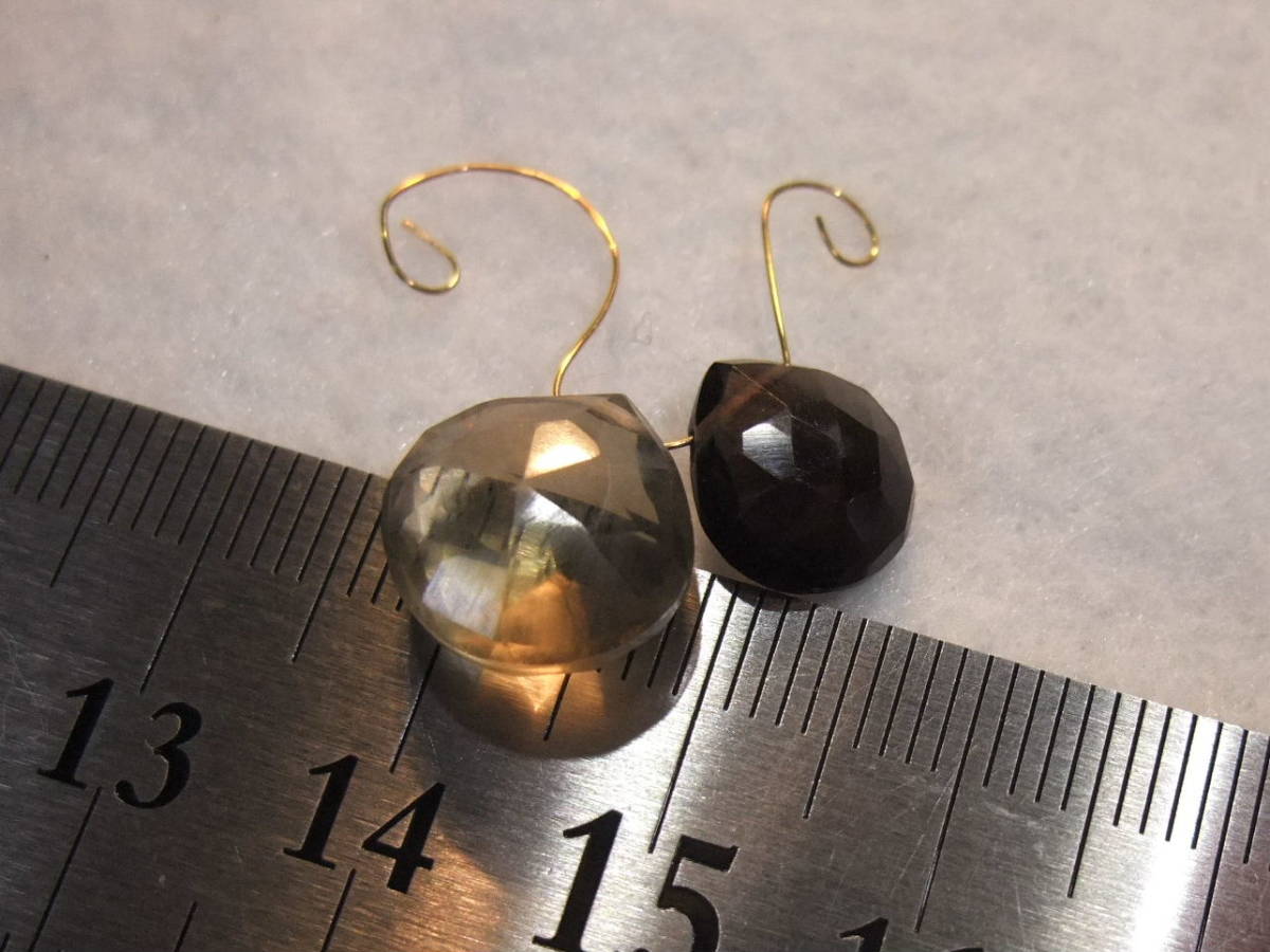 古い在庫のスモーキークォーツ煙水晶とレモンクォーツ。カットの施された両穴のクレオパトラタイプのお素材ルースになります。石質もまずまずで製作映えするルースと思います☆