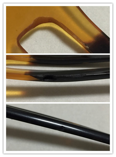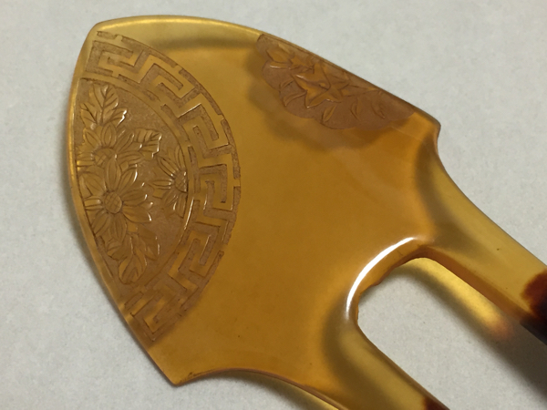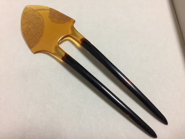 アンティークの白甲・黒甲の本鼈甲を使用し、花細工を施した、鋒形の簪です。3ヶ所虫食いがあります。 長さ14.5cm、幅4.5cm、重さ8.2g