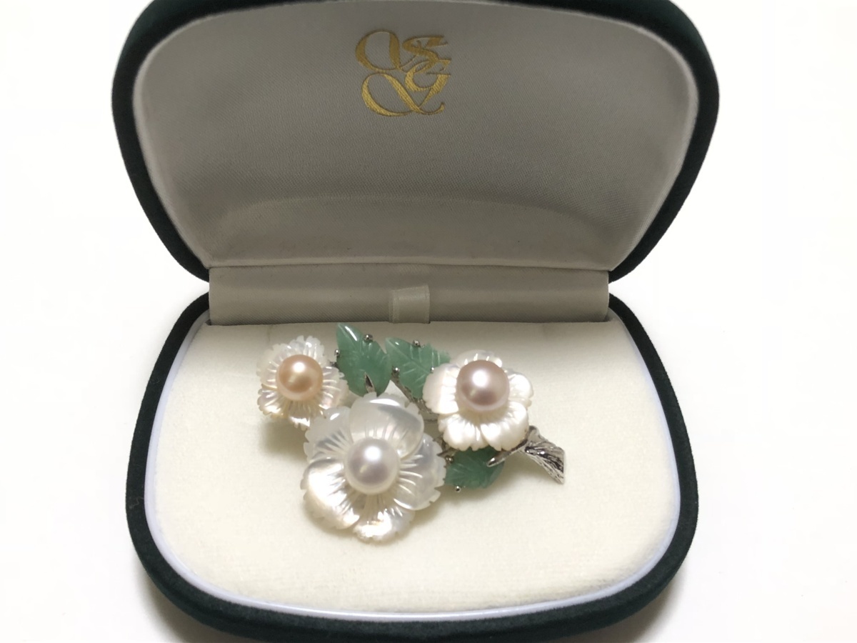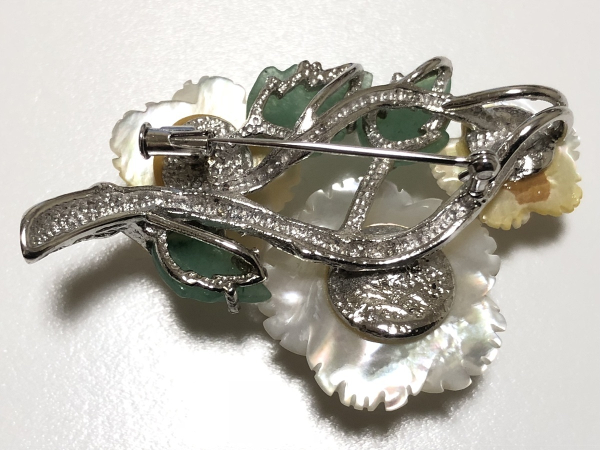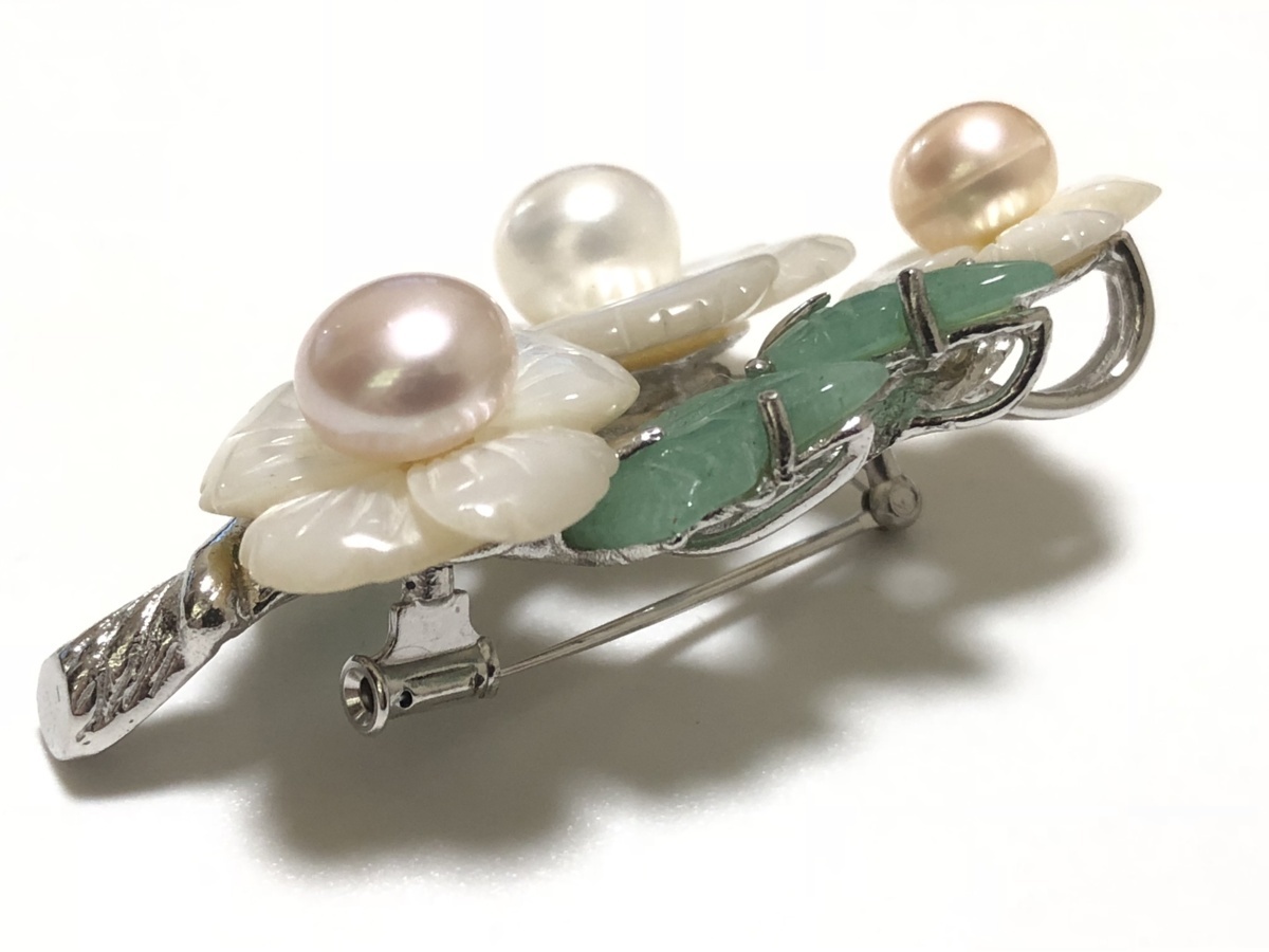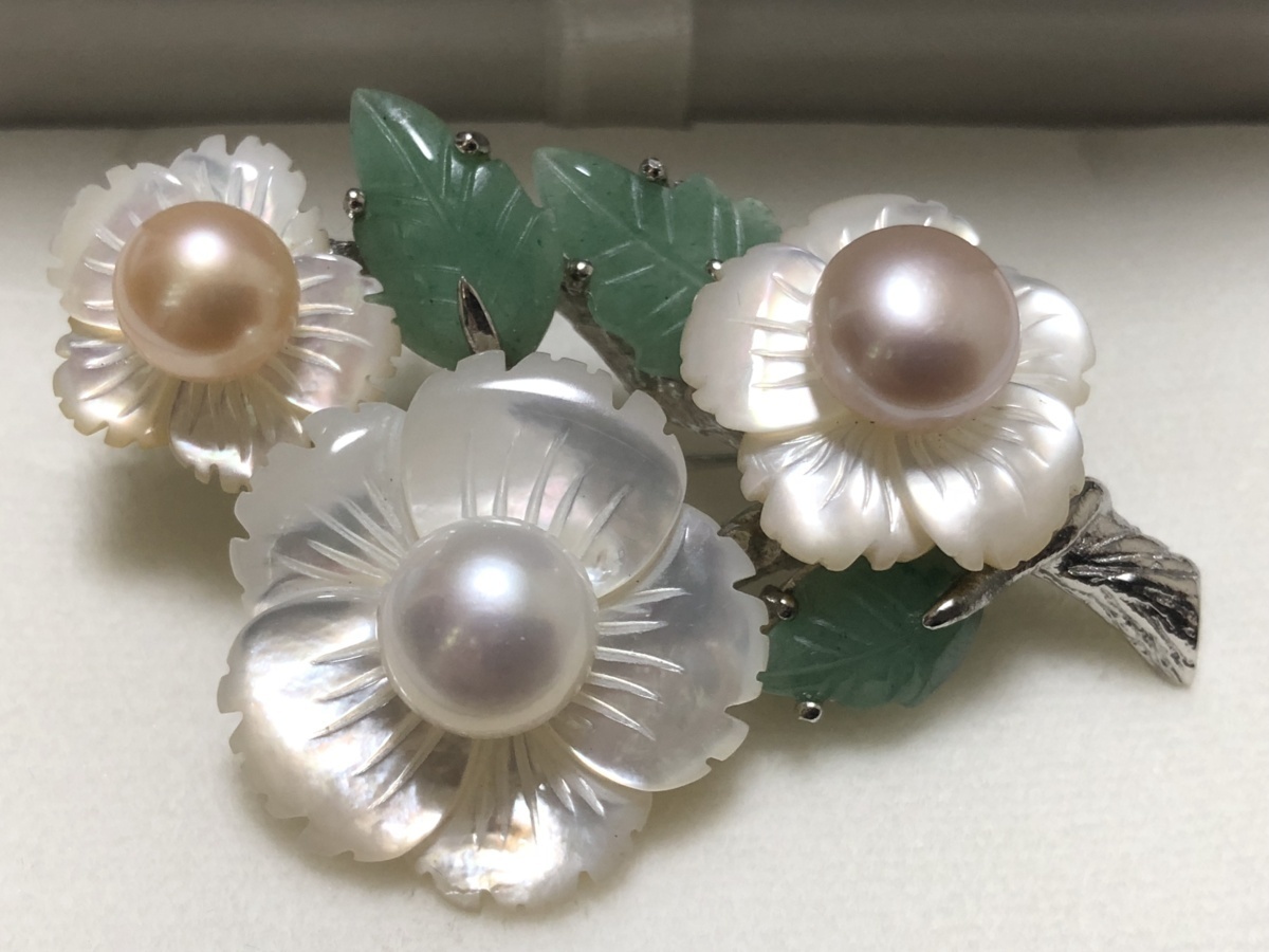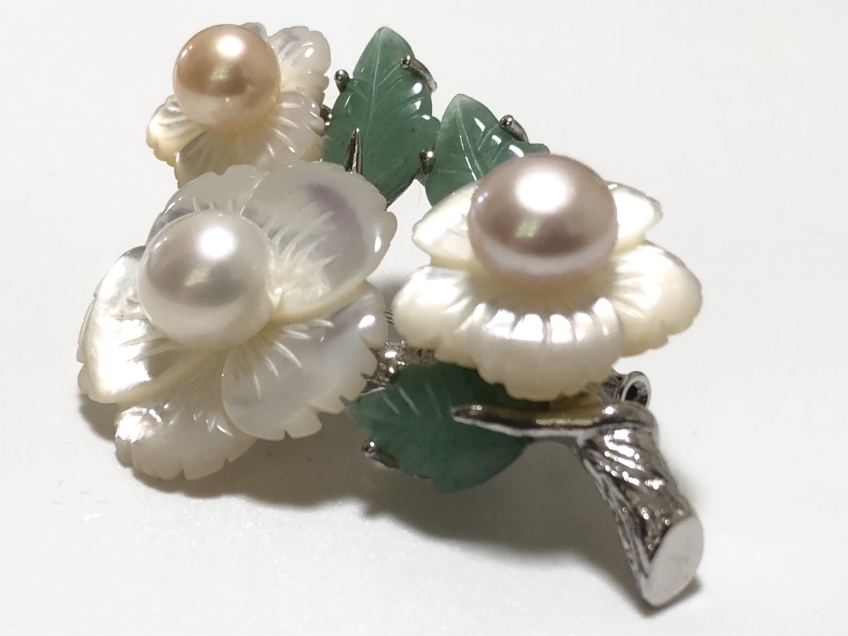 3色(ゴールド・ピンク・ホワイト)ボタン真珠 白蝶貝 アベンチュリン SILVER925 16.8g 桜 ブローチ 美品 ケース付属
