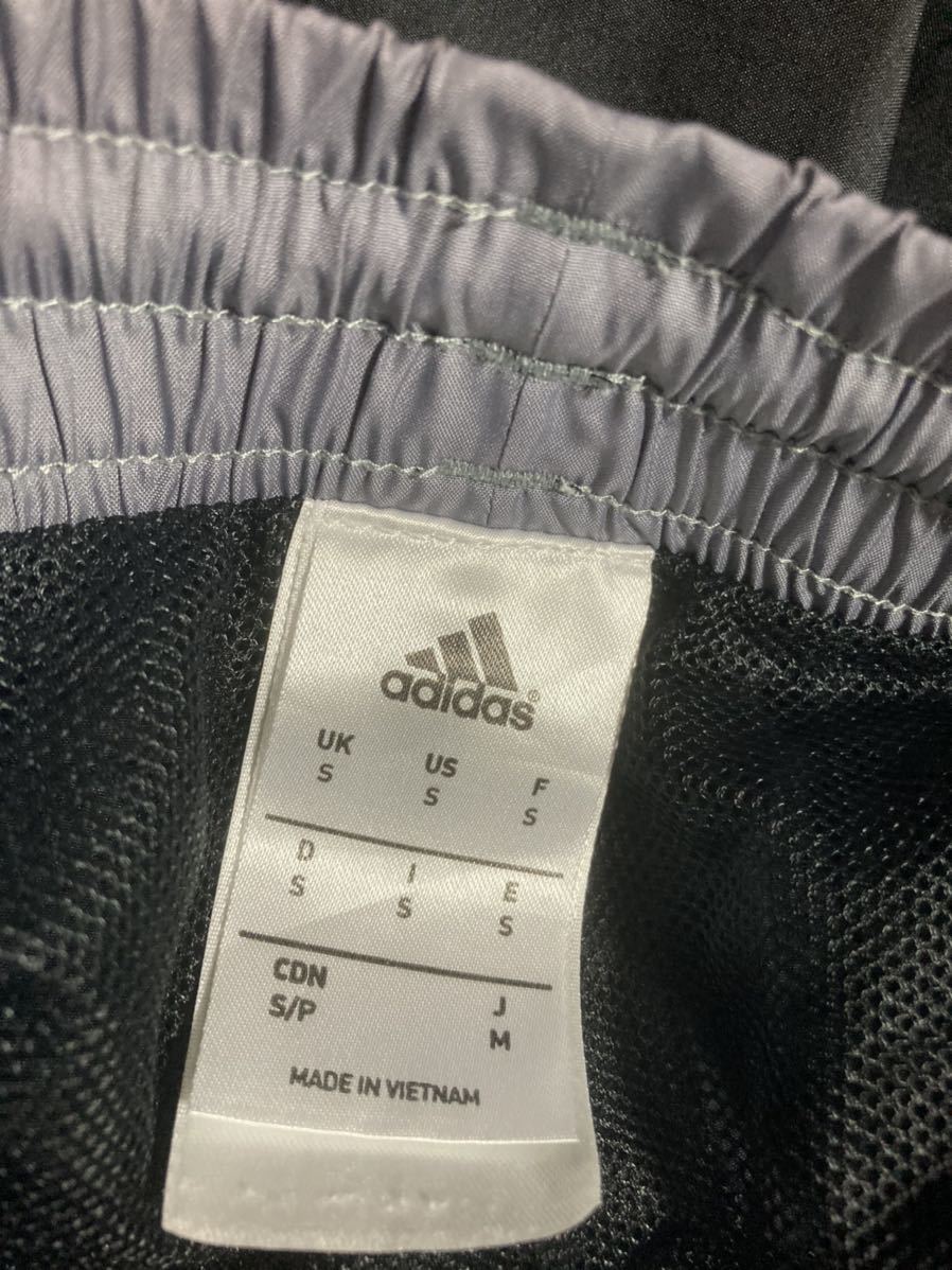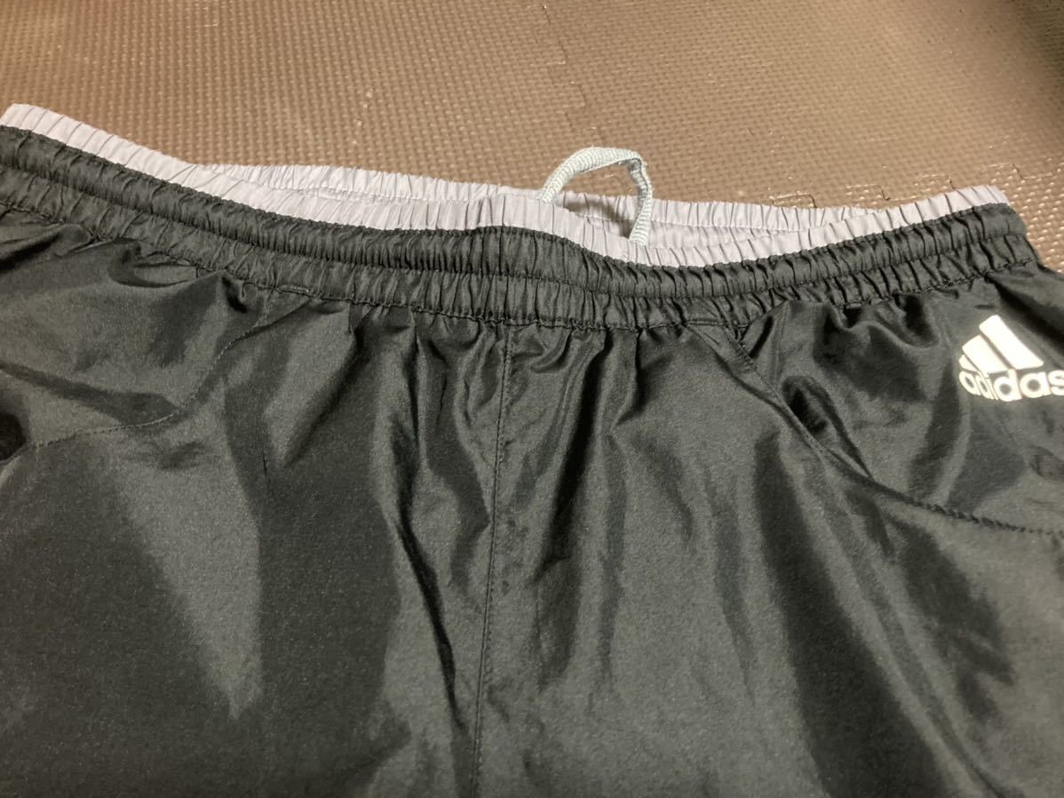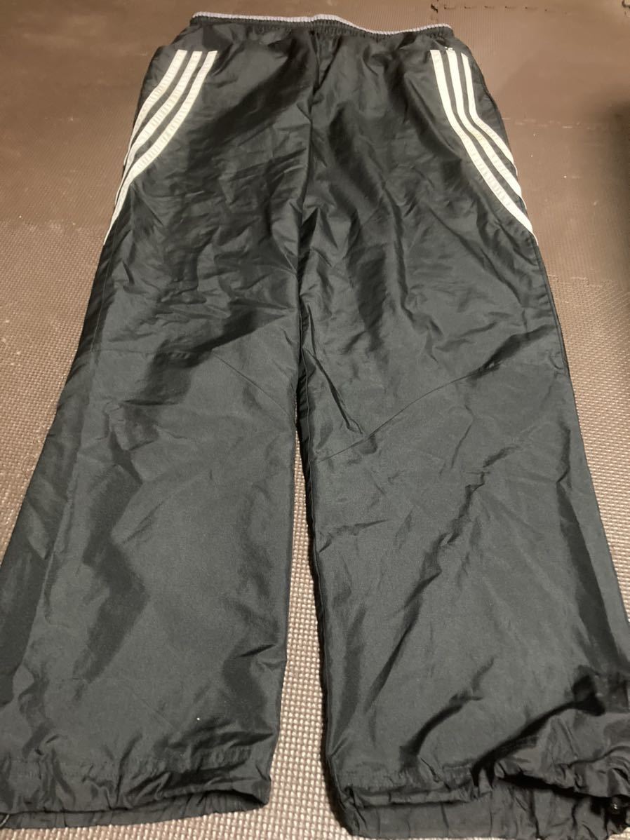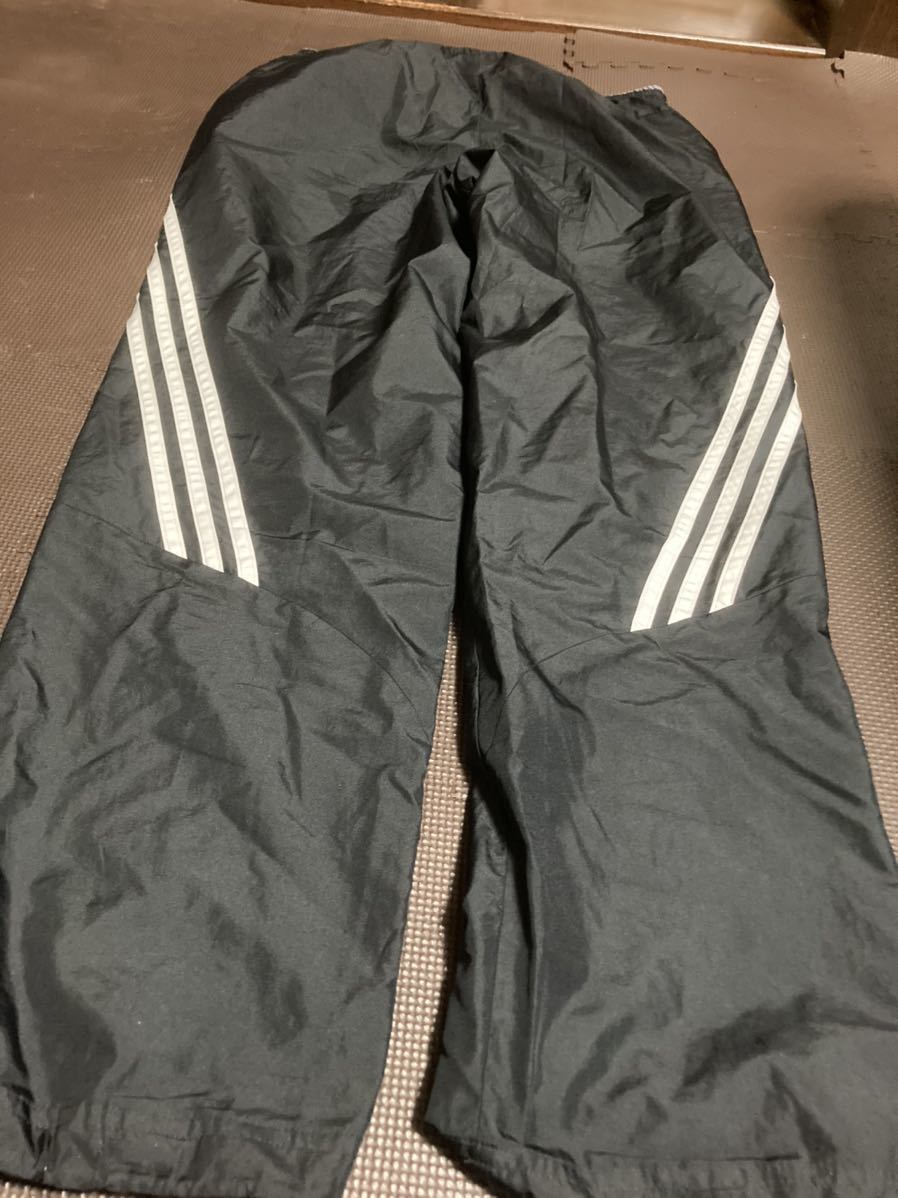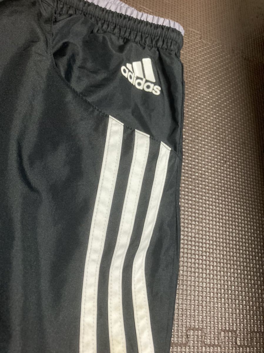 超美品adidas黒、グレー、ロゴ白、ライン白3本パンツ