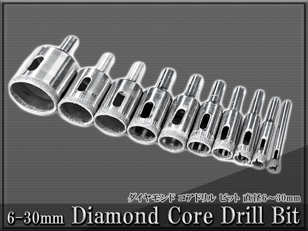ダイヤモンドコアドリル 10点セット 6mm/8mm/10mm/12mm/14mm/16mm/18mm/20mm/22mm/30mm ガラス セラミック タイル 掘削 ダイヤモンドビット