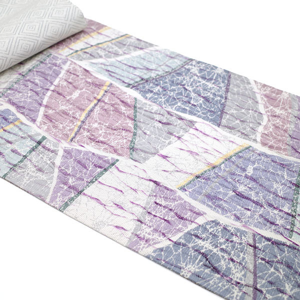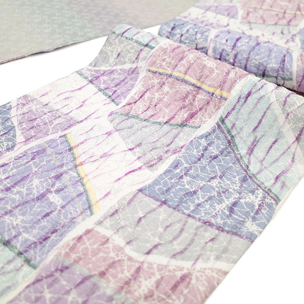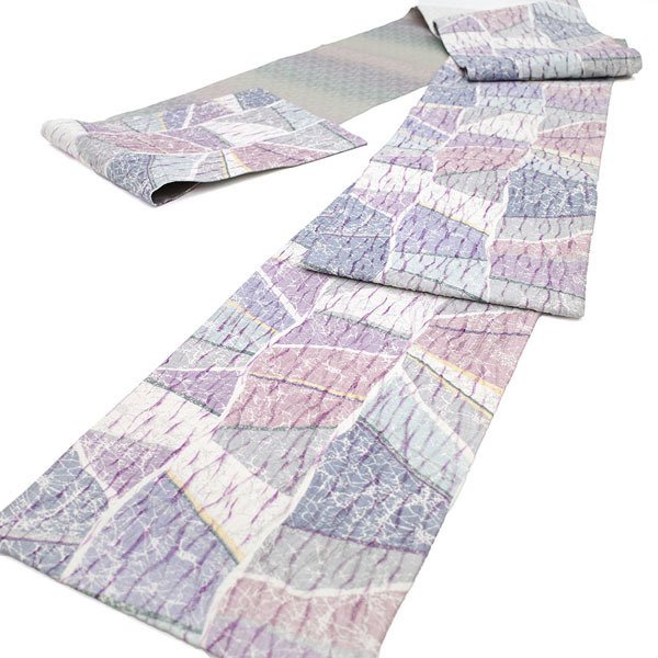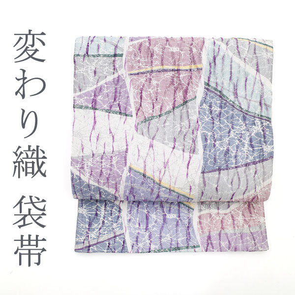 袋帯 立体感のある変わり織 オフホワイト 紫 水色 藍紫 ステンドガラス調 正絹 絹 カジュアル 未使用 新品 仕立て上がり みやがわ sb9914
