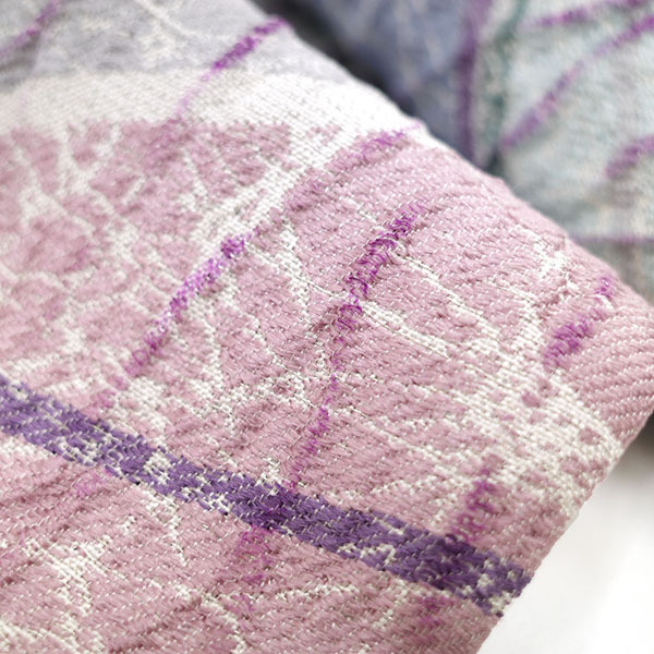 柄行は 紫・水色・藍紫などの色合いで、ステンドガラスのようなデザインが織にて表現されています。