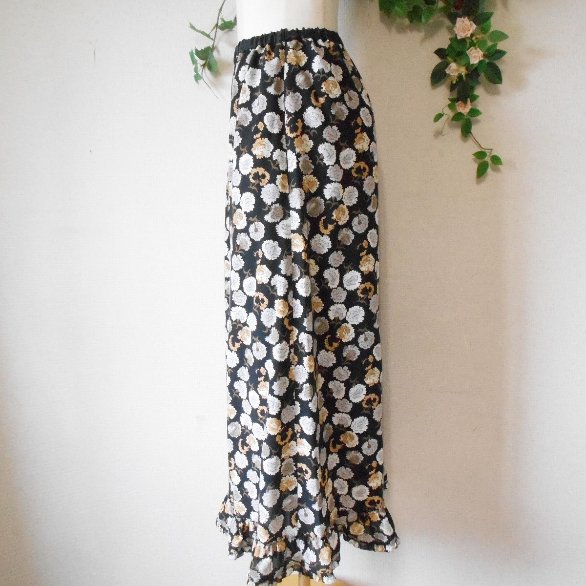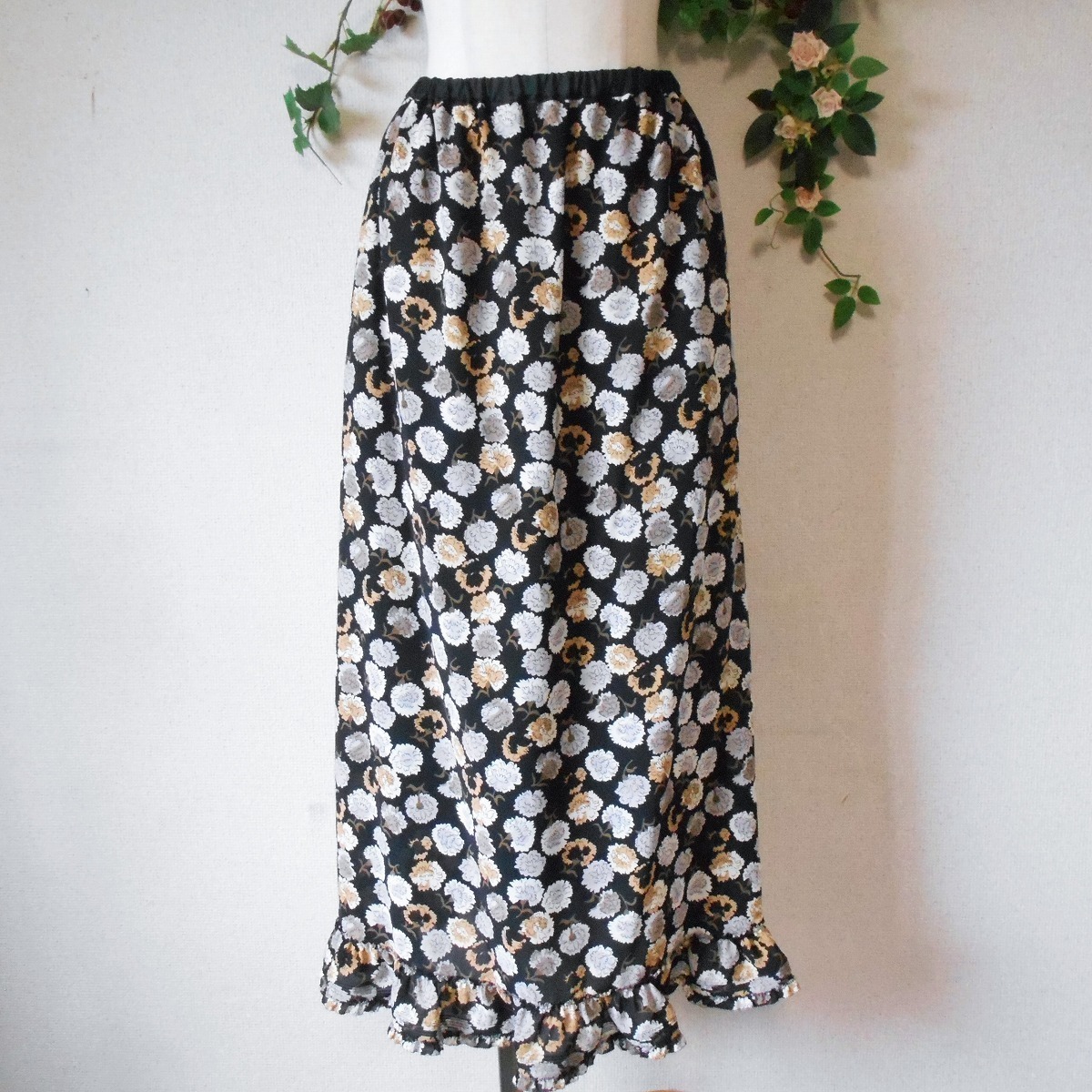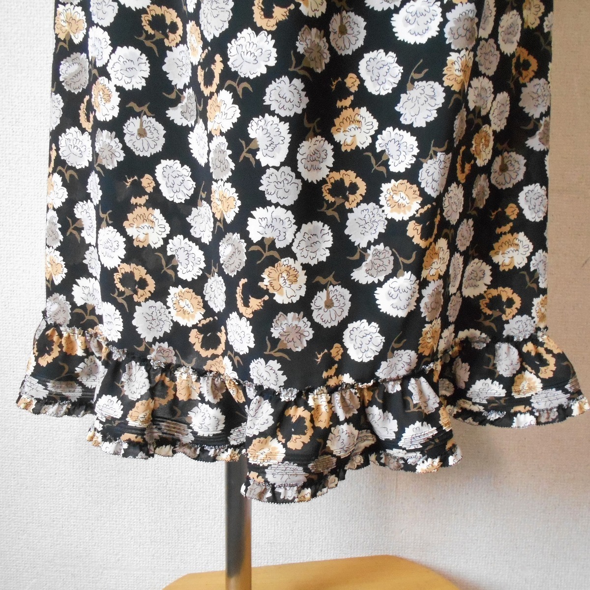 【ポイント】カネコイサオさんのスカートになります。お色は黒色ベースでベージュ系や薄グレー等のお花のプリントが全体に入っています。裾にはピンタックとフリルが使用されていてとっても素敵な一着です。