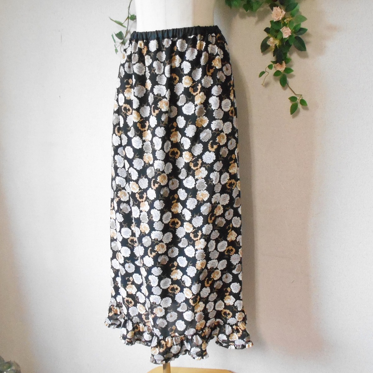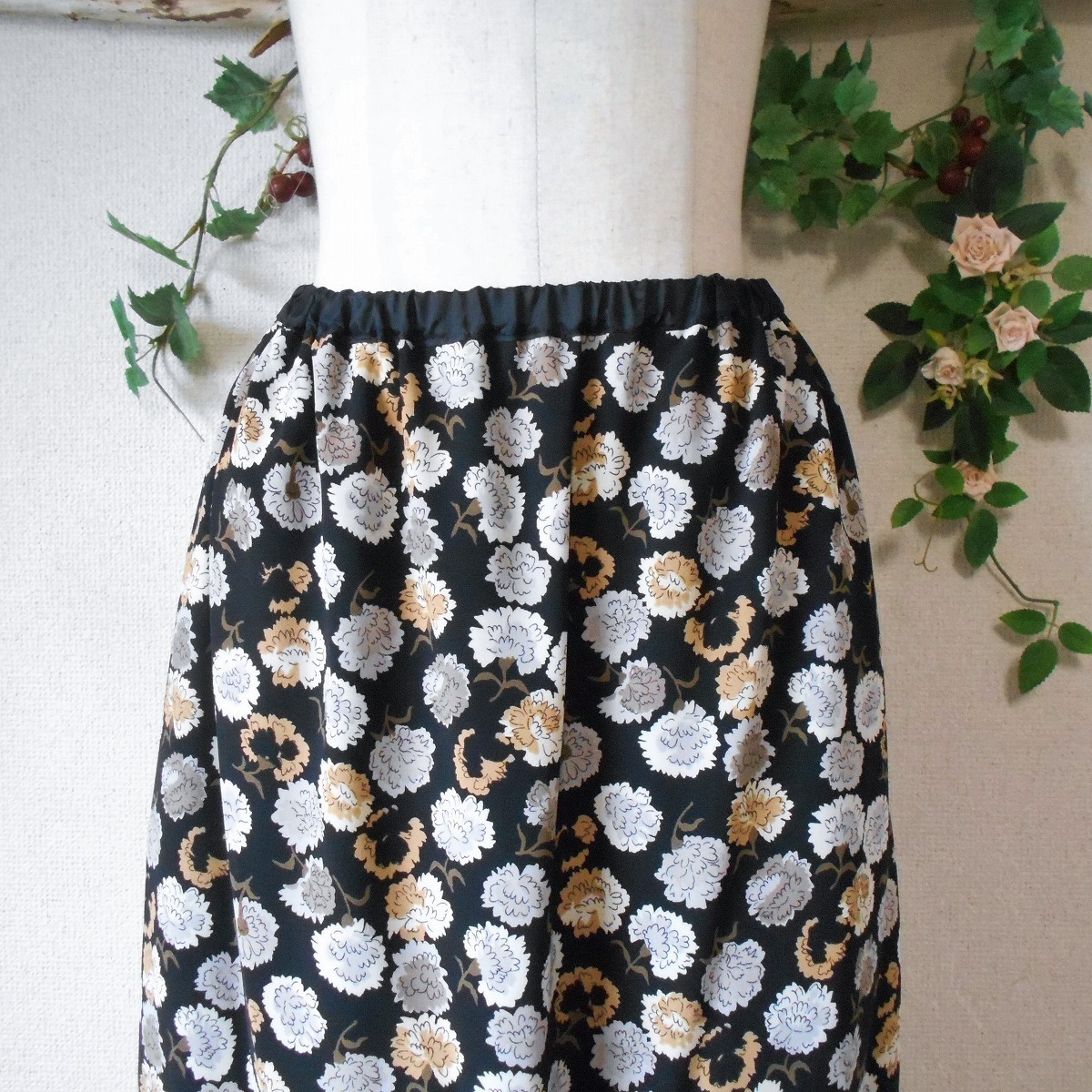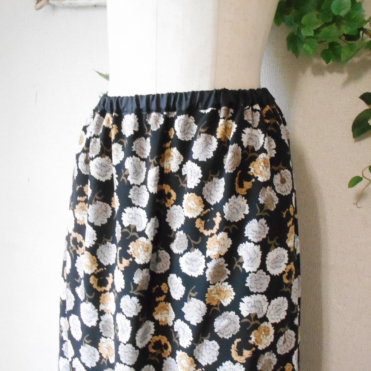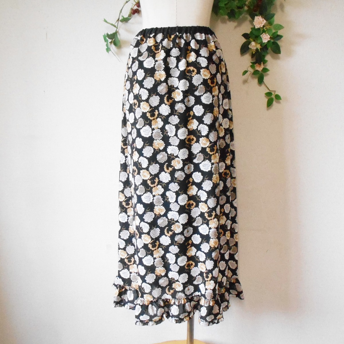 【ポイント】カネコイサオさんのスカートになります。お色は黒色ベースでベージュ系や薄グレー等のお花のプリントが全体に入っています。裾にはピンタックとフリルが使用されていてとっても素敵な一着です。