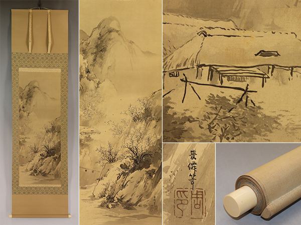 土田麦僊 つちだ-ばくせん(1887-1936) 明治-昭和時代前期の日本画家。明治20年2月9日生まれ。土田杏村の兄。 鈴木松年,竹内栖鳳にまなぶ。明治41年から文展に出品。 大正7年村上華岳,小野竹喬らと国画創作協会を結成。帝国美術院会員。 昭和11年6月10日死去。50歳。新潟県出身。京都市立絵画専門学校卒。本名は金二。 本紙は、染み、ヤケがあります。 表装は、染み、汚れ、軽い皺があります。 【サイズ】 作品 横約39cm×縦約104.5cm 表装 横約52cm×縦約192cm |