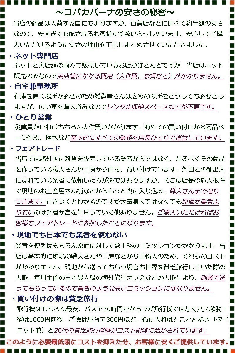 ・明細書&領収書  取引ナビから発行してください。当店では二重発行を防ぐため発行できません。 ・長期休業  当店は海外買い付けのため、長期休業が年に数回ございます。期間によっては開店したままで帰国後に発送の場合もございます。ヤフオクにはカレンダー機能がないため、コパカバーナYahoo!ショッピング店にてご確認ください。