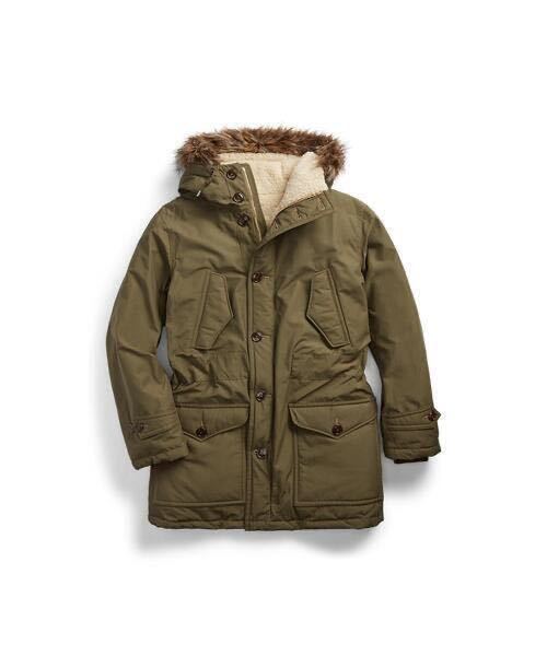 ワックス加工のファイユを使ったクラシックな雰囲気の7分丈パーカー。中綿に革新的なリサイクルポリエステル繊維であるPrimaLoft ThermoPlumeを使用し、ダウンのような風合いと性能を実現。特製のダイスタンプ加工を施したブラスジッパー。身頃上部とフードにフリースの裏地。身頃下部にダイヤモンドキルトの裏地。フードにフェイクファーのトリム付き。リブのストームカフス。