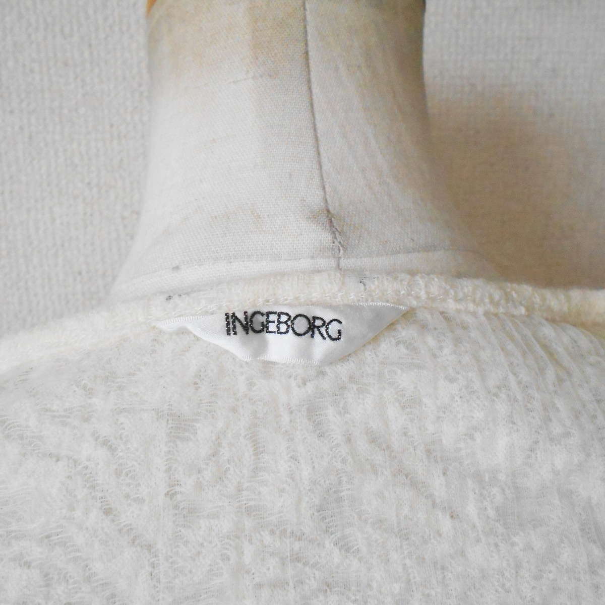【ポイント】2016年に販売されたインゲボルグの薄手セーターになります。お色はオフホワイトで春や秋を中心に着ていただけるお品です。少し透け感のある薄さでお袖と身頃の下はレースが使用された、とっても素敵な一着です。