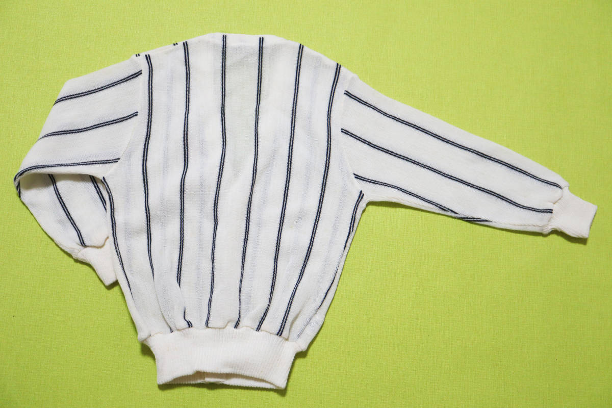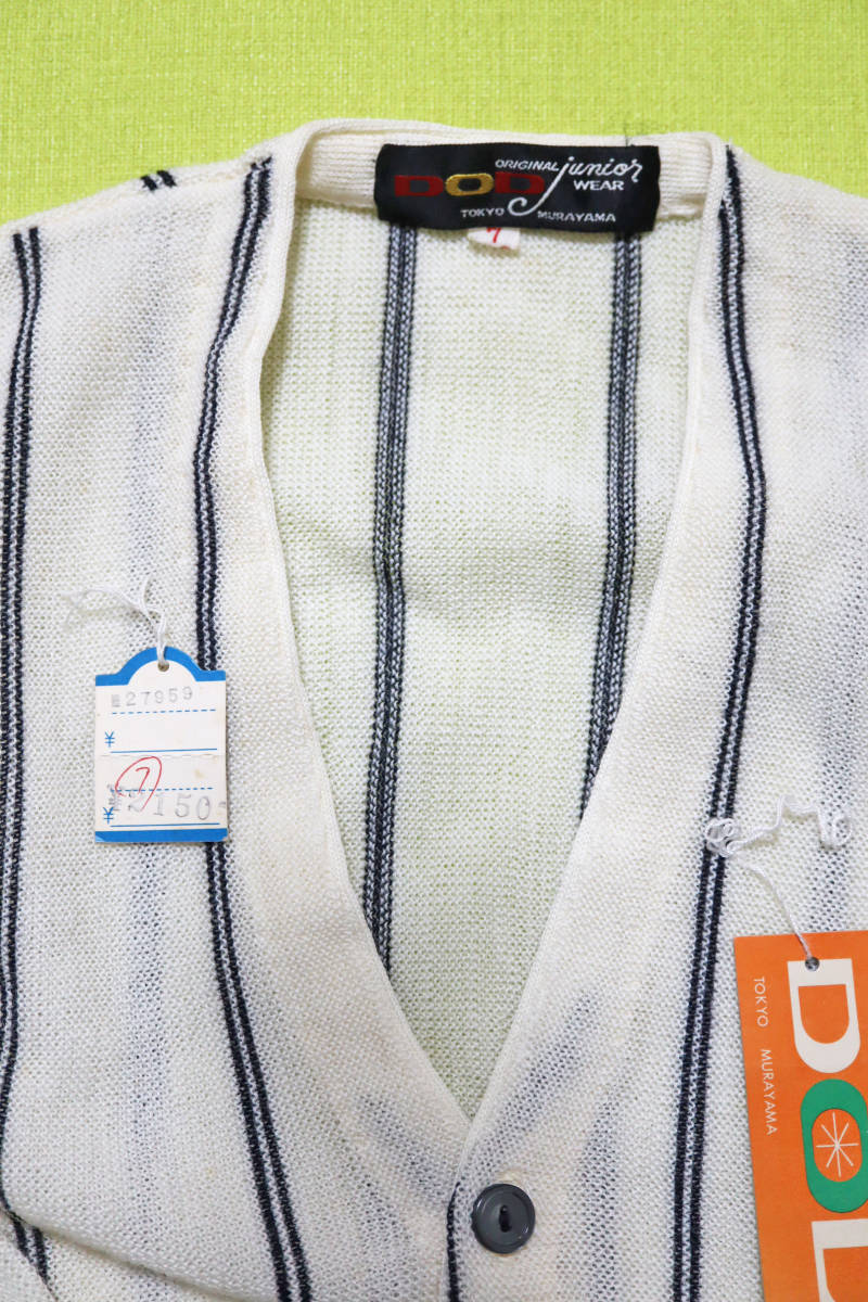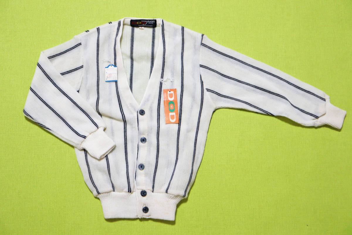 男の子の長袖カーディガン。 村山のお品物。 ふんわりと編まれた軽い生地。 白地にストライプ。 袖口と裾は、ゴム編み。 「7才」の表示です。 120㎝位かと思います。 下記の実寸をご参考下さい。 *サイズ:胸囲68 着丈44 肩幅28 袖丈38 *素材 :アクリル60 ウール40 *メーカー希望小売価格(税抜き):@2150 *備考 :デッドストックです。 保管シミあります。(画像参照) 落札の際は、その旨ご了承下さい。 | |||