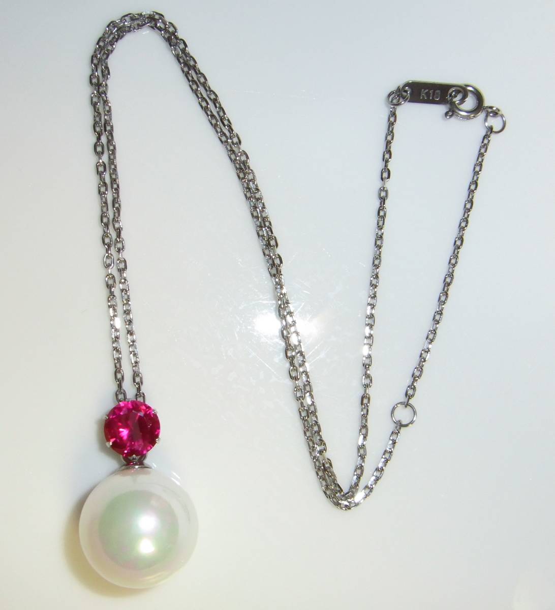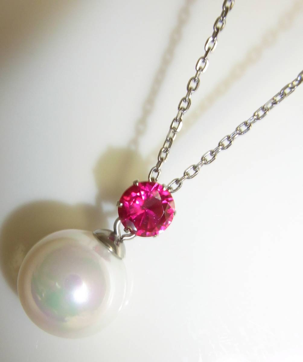 ★大粒 真珠 貝パール 花株タイプ 光沢虹色 合成ルビー ステンレス製 ネックレス ペンダント★ | |||