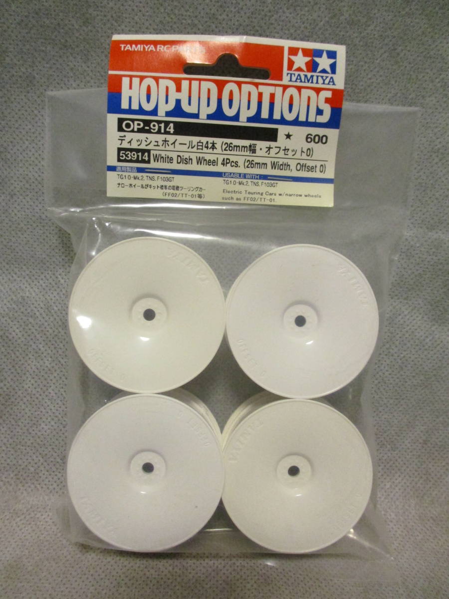 未使用未開封品 タミヤ OP-914 ディッシュホイール白4本(26mm幅・オフセット0) 53914、になります。
