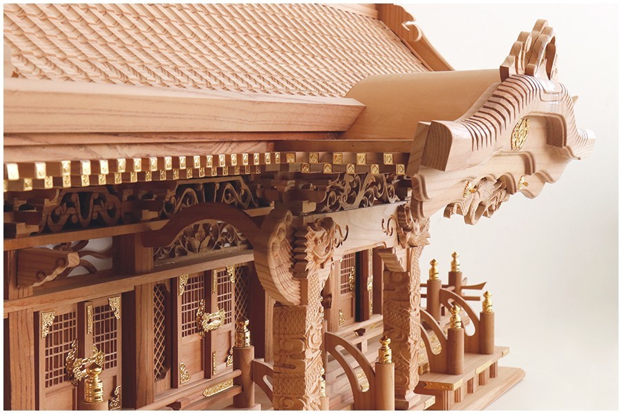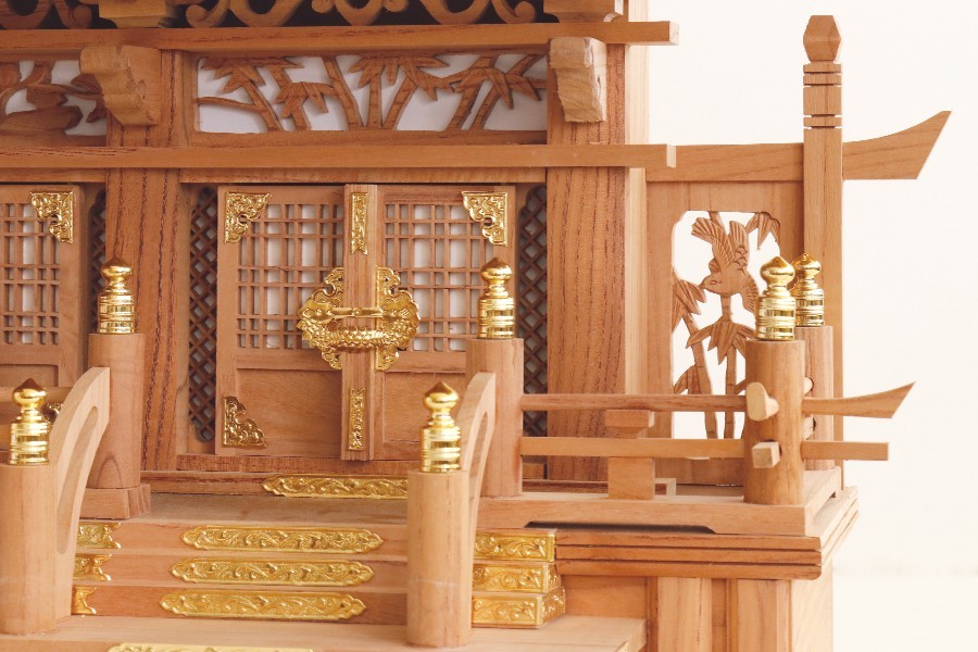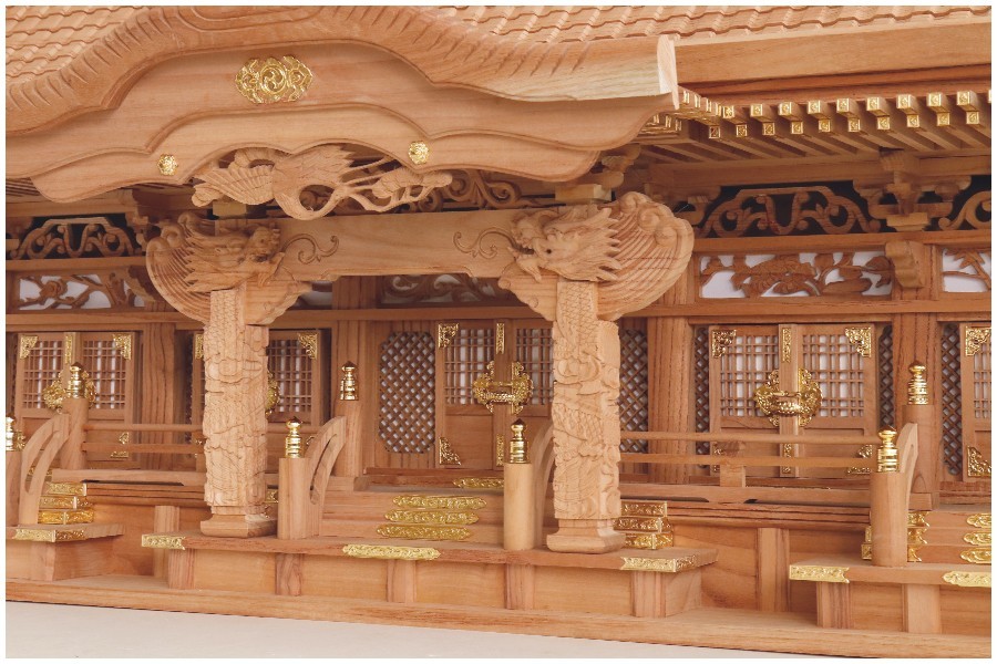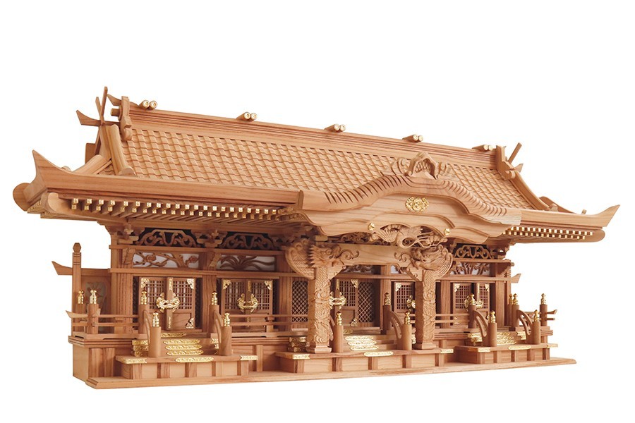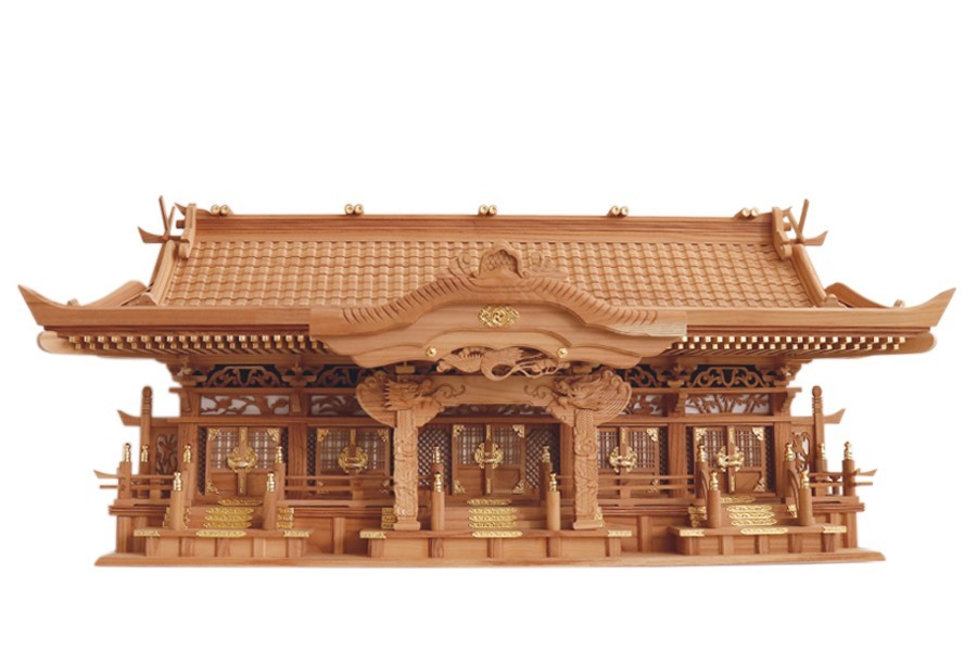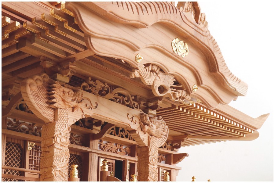 豪華絢爛、極みの神棚 阿吽の龍神と鶴が舞い躍る、圧巻の大社。細微な彫刻と真鍮金具が散りばめられ、工芸品のたたずまい。手を合わせ、悠久のご加護と平穏をお祈りします。 |