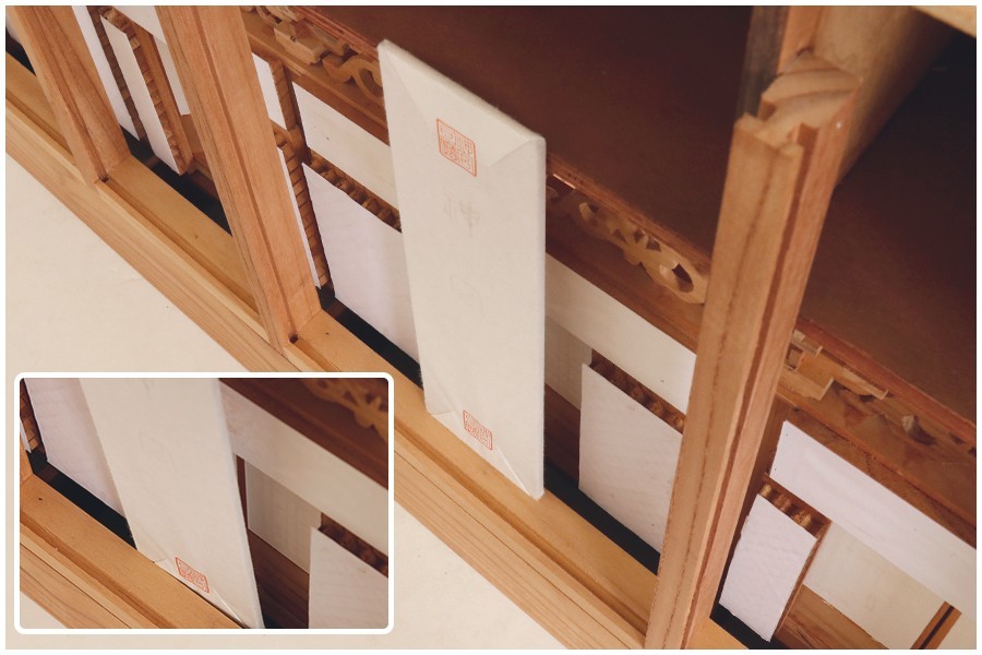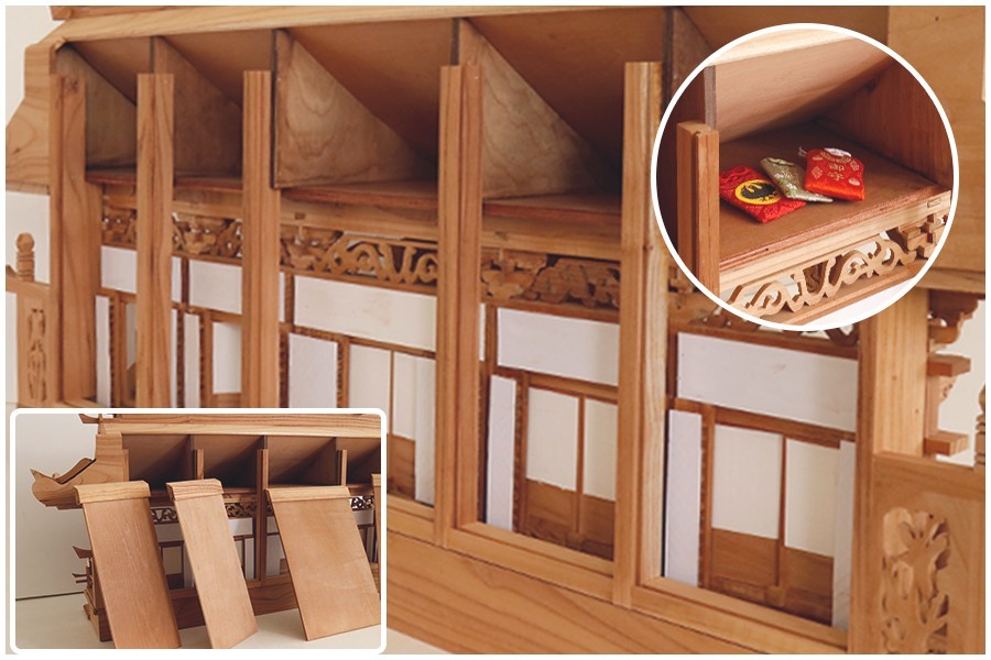 【材質】 香椿材 【サイズ 約(cm)】 お社本体:高さ58 幅138.5 奥行25 お神札が入るスペース 中央:高さ46 幅22 奥行3 / 左右:高さ46 幅15 奥行3 お守りが入るスペース:高さ13 奥行17 |