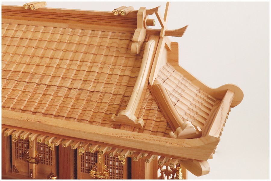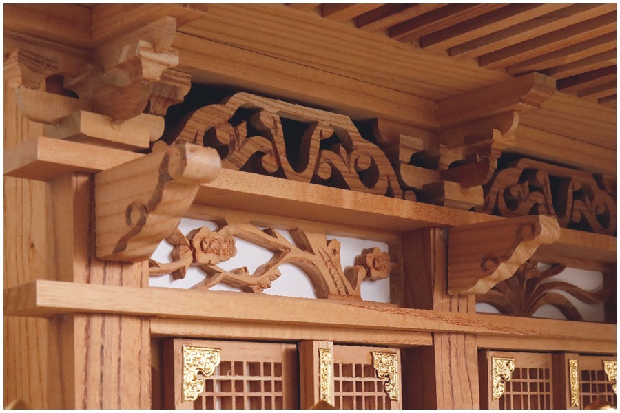 皆様の門出に、盛大な祭壇を 横幅 138センチ、神棚製品の中でも最大級の大きさ。琥珀色のお社は、香椿材と呼ばれる硬く反りの少ない木材で作られています。高級家具にも使われ、ケヤキ材に似た荒々しい木目は猛々しい外観が特徴的ですが、大きなお社の隅々には細かな彫刻加工が施されています。唯一無二の存在感、祀れば地の神々が宿る、大社の造り。 |