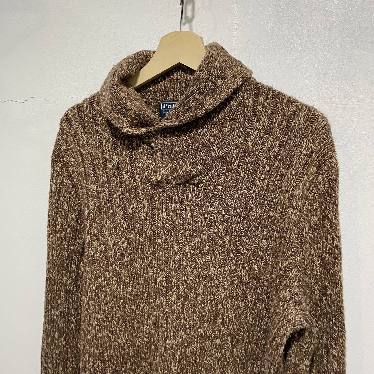 ご覧いただきありがとうございます。ラルフローレンのショールカラーミックスニットセーターです。ブラウンとベージュのカラーでミックス編みされたコットンリネン素材です。シャツなどの相性も良さそうな一枚です。いかがでしょうか。
