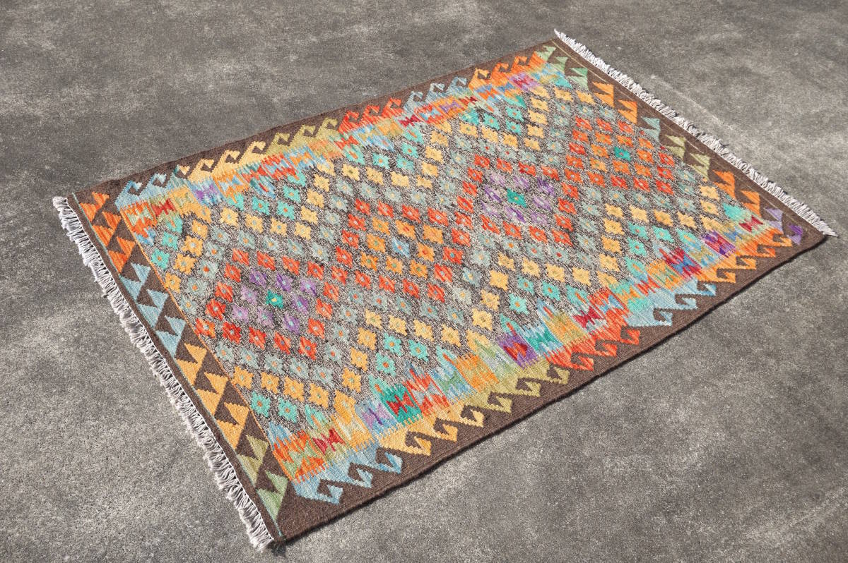 未使用品 アフガンキリム 147cm×100cm パステル系マルチカラー トルクメン族 手織りカーペット 幾何学 ネイティブ アフガニスタン ④