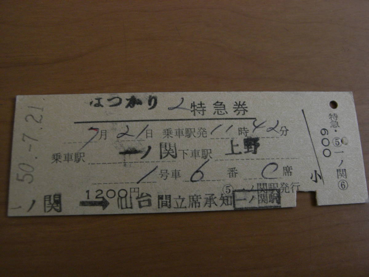 はつかり2号 特急券 乗車駅 一ノ関 下車駅 上野 昭和50年7月21日発行 一ノ関駅発行