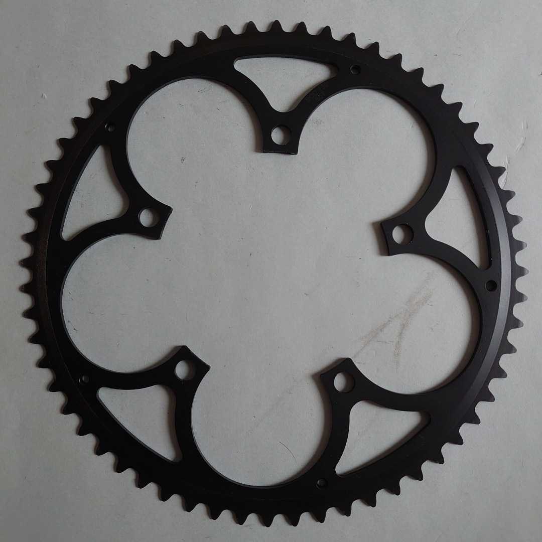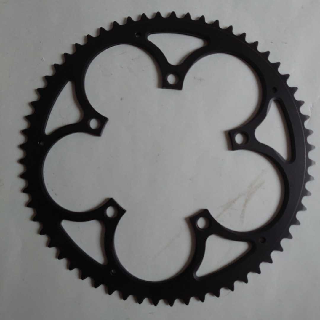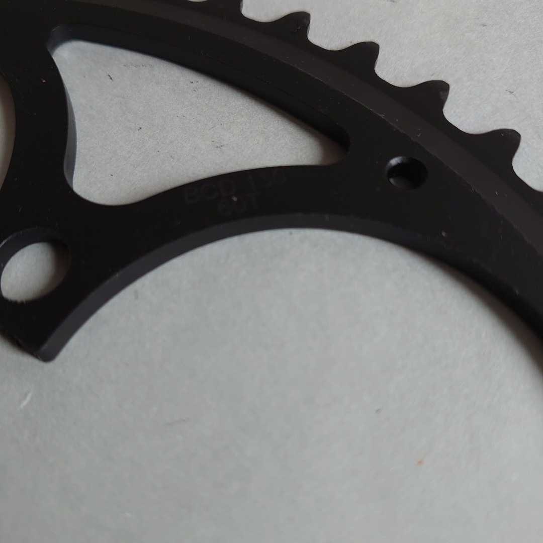 超大径60Tアウターチェーンリングになります。PCD130mm。未使用です。自家塗装でブラックに塗装しております。素人の塗装ですのでキレイではありませんが、表面に大きなキズなども無く個人的には美品の部類かと思います。ダンボールで挟んで発送予定です。発送作業は土日のみとなります。