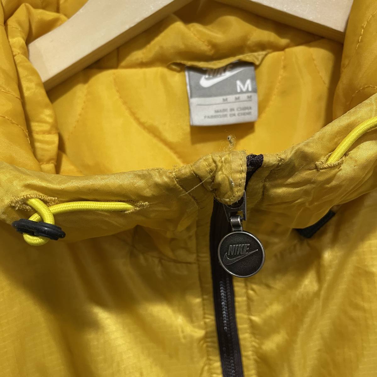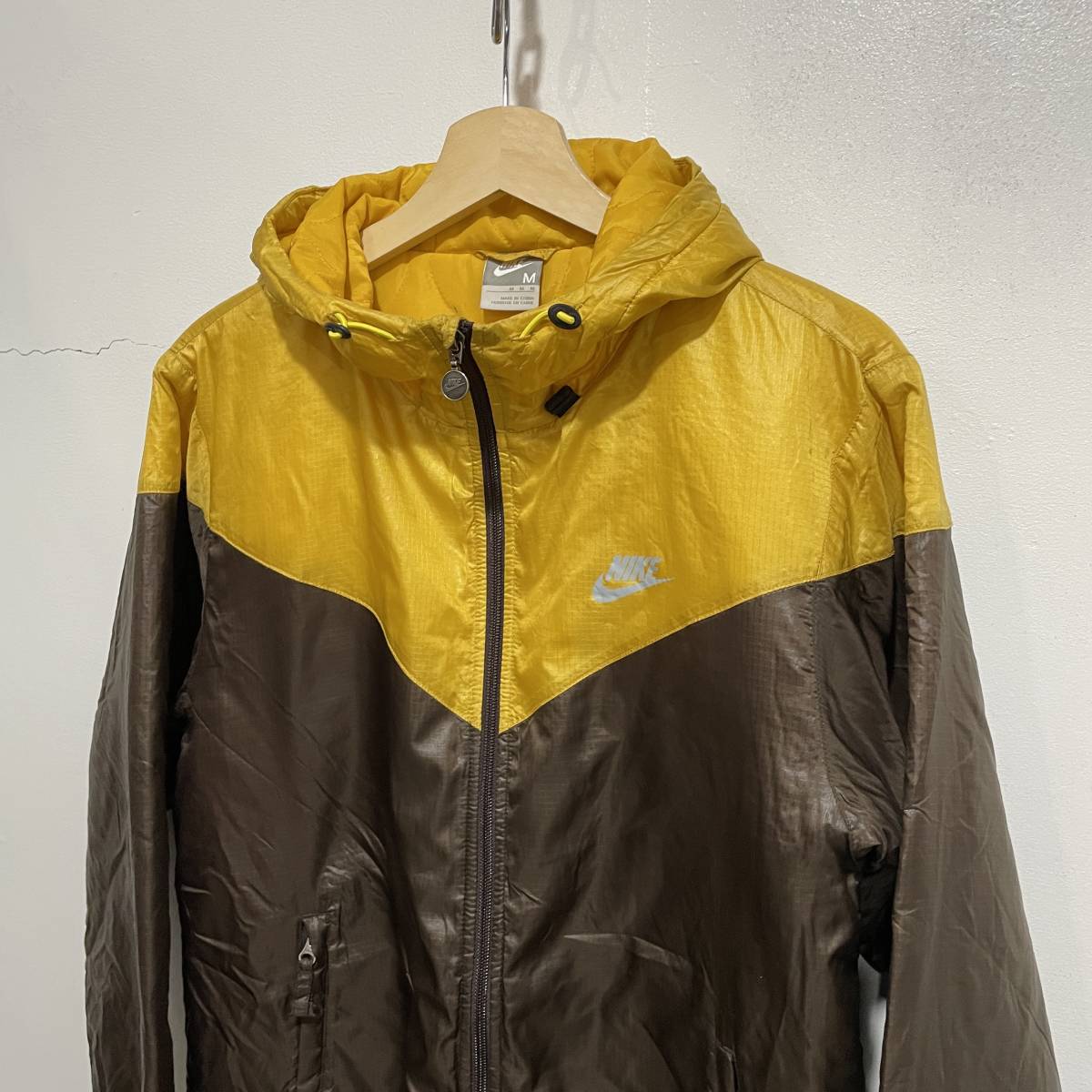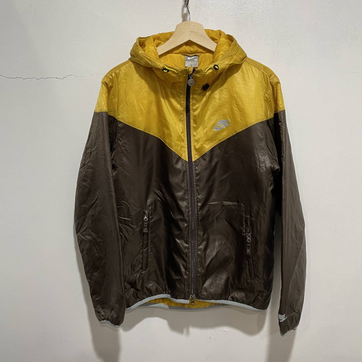 ☆送料無料☆NIKE☆ナイキ☆中綿フードジャケット☆配色切替☆スポーツ☆リップストップ☆Mサイズ☆黄色×茶色☆D21c