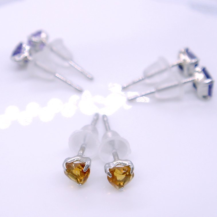 可愛らしいハートとスクエアカットのアメジストとシトリンのプラチナピアスが3個(3ペア)セットで¥13,500!