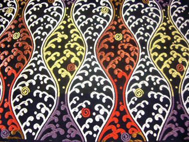 黒色地に白色・オレンジ色・黄色・紫色・金茶色で立涌文様とその中に渦巻き雲文様を織り込んだモダンで華やかな金襴です