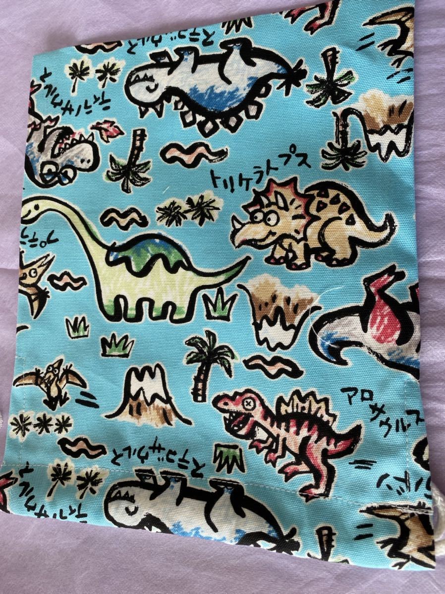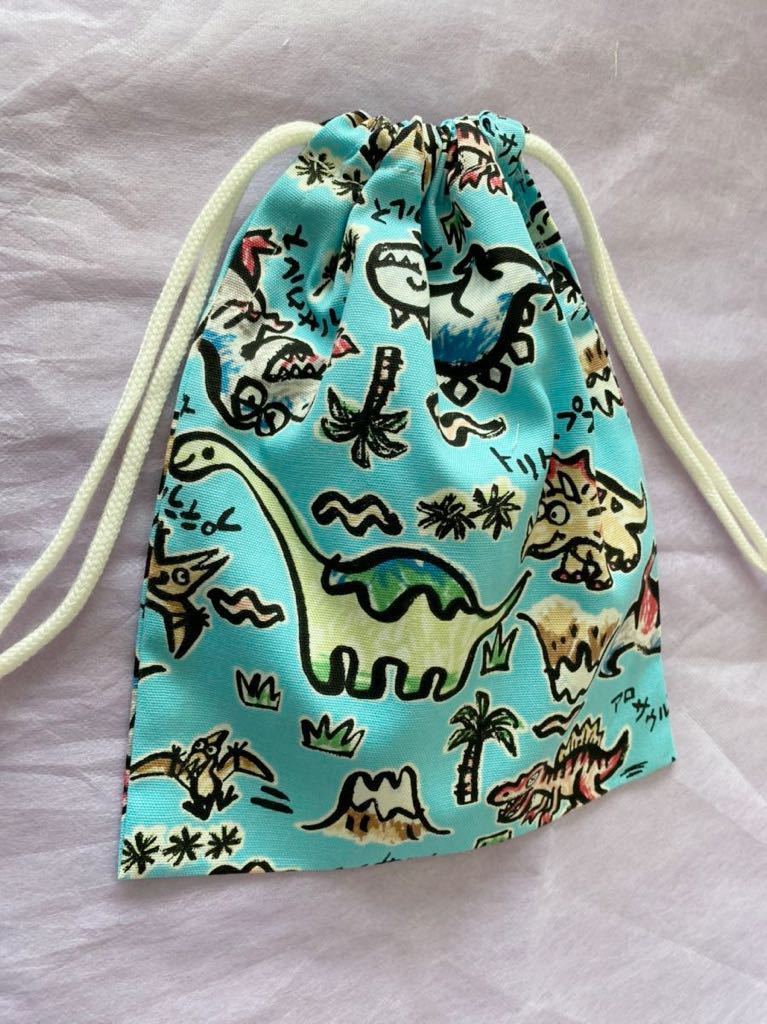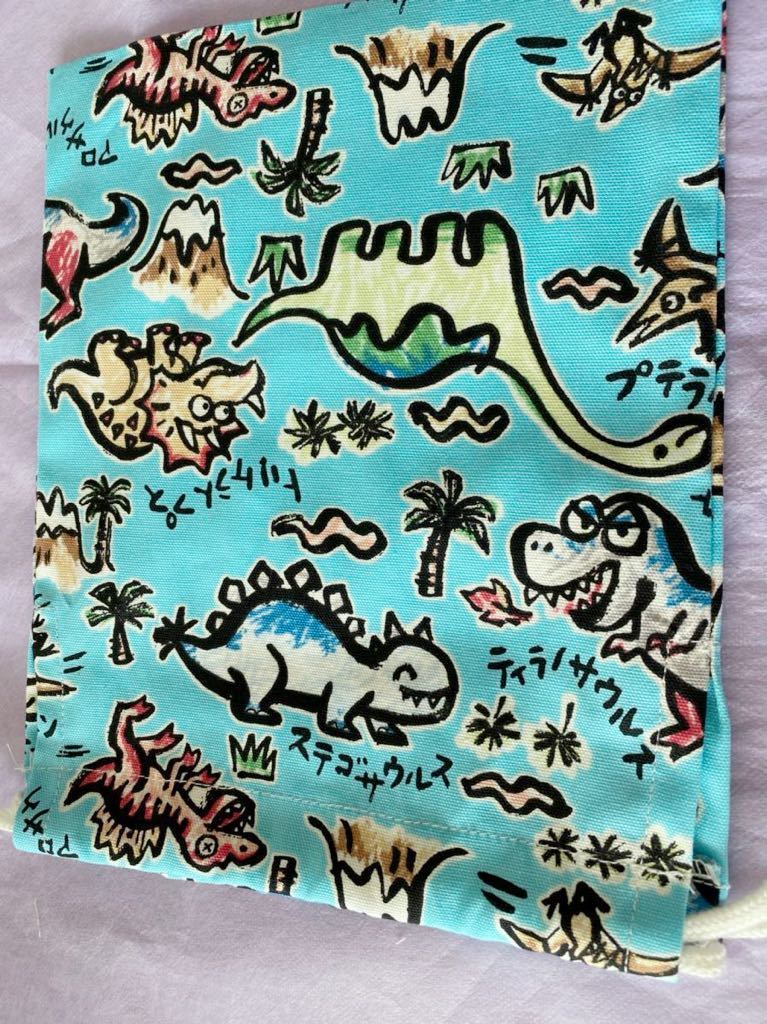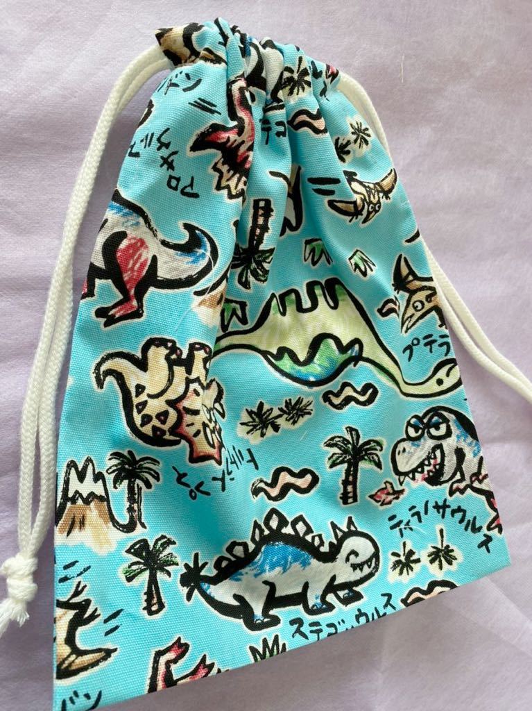 NO.25 裏なし巾着袋 小物入れ 給食袋  ハンドメイド  水色恐竜柄