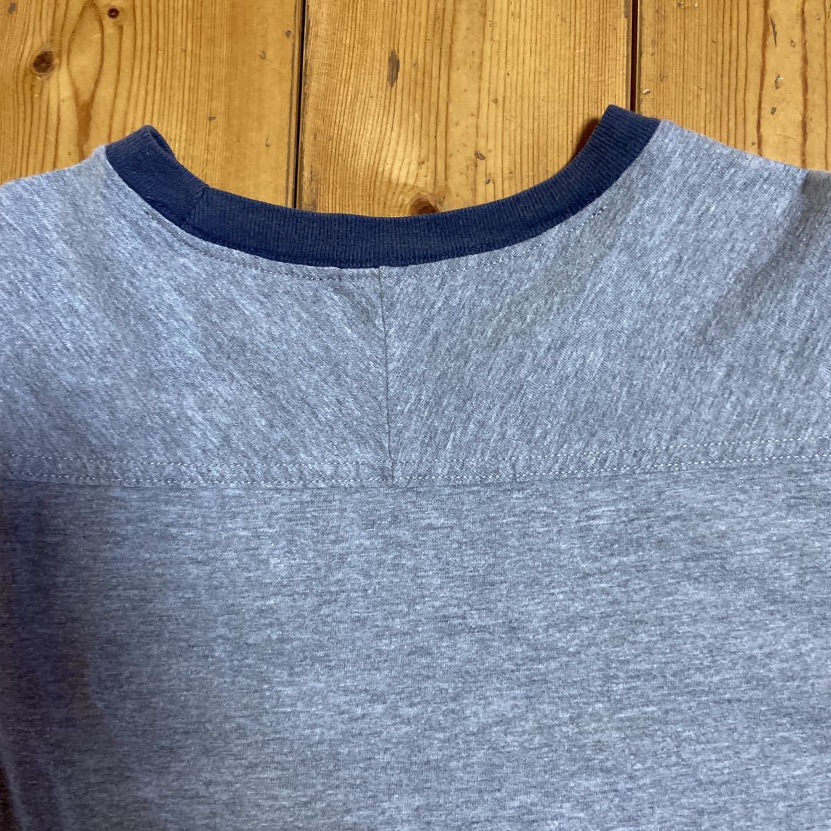 お色はグレーで襟は紺色のアクセントカラーの縁取りです。