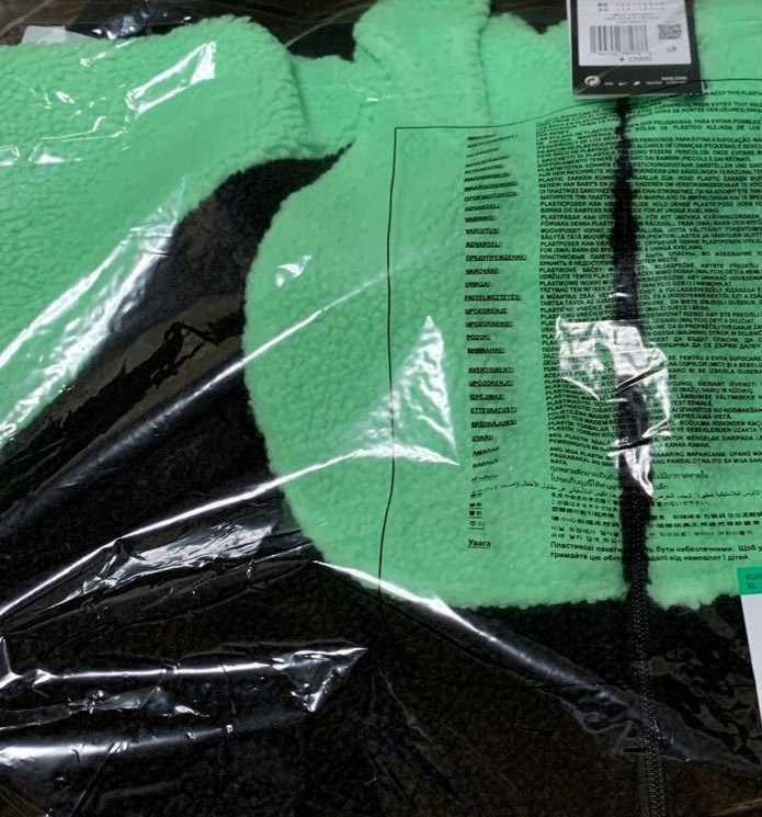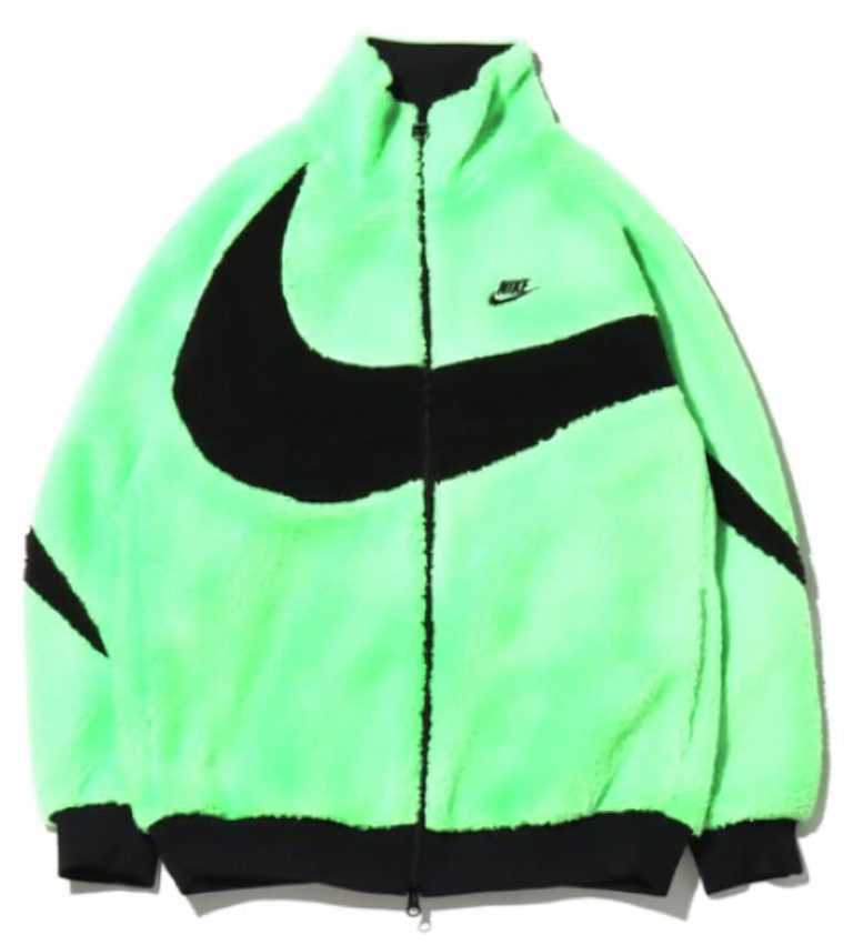 胸元から袖にかけてぐるりと配置された大きなスウッシュロゴが特徴的なデザインとなり、ボア素材とナイロン素材のリバーシブル仕様になっています。