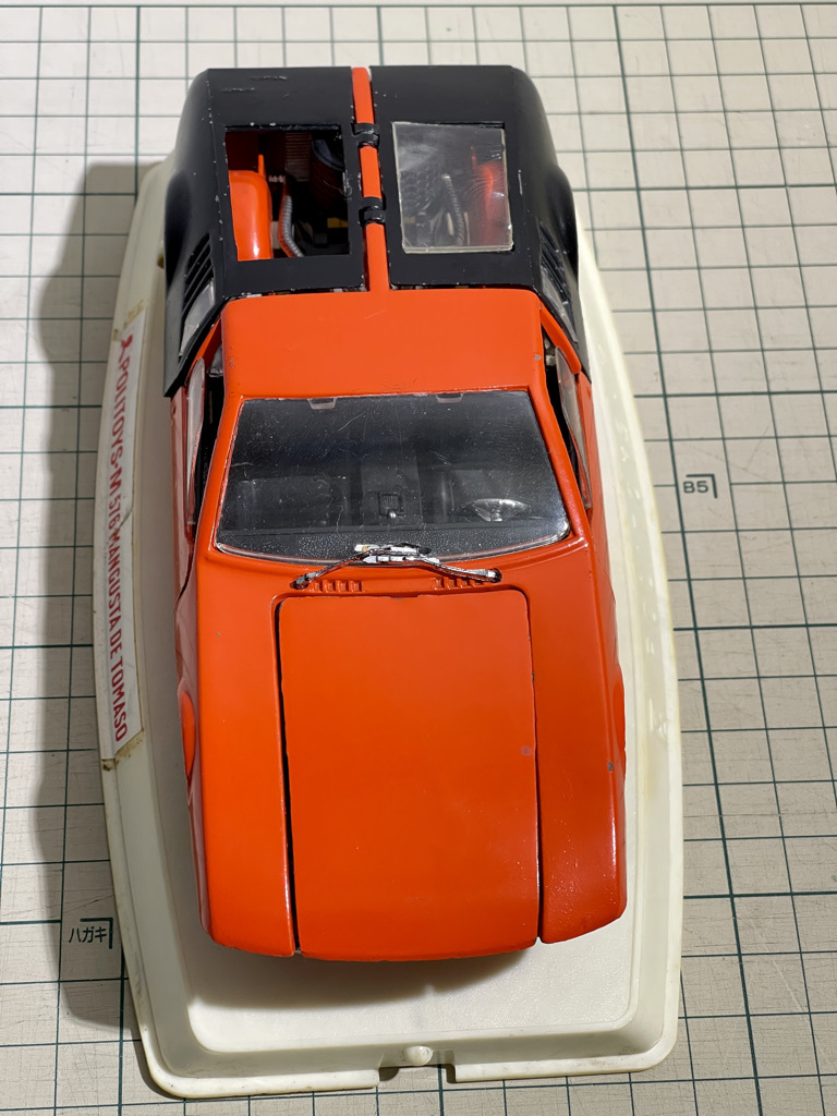 ポリトーイMシリーズ576番のデ・トマソ・マングスタ、カラーはオレンジ/マットブラック、スケールは1/25です。ステアリングギミックも備わった大型モデルです。