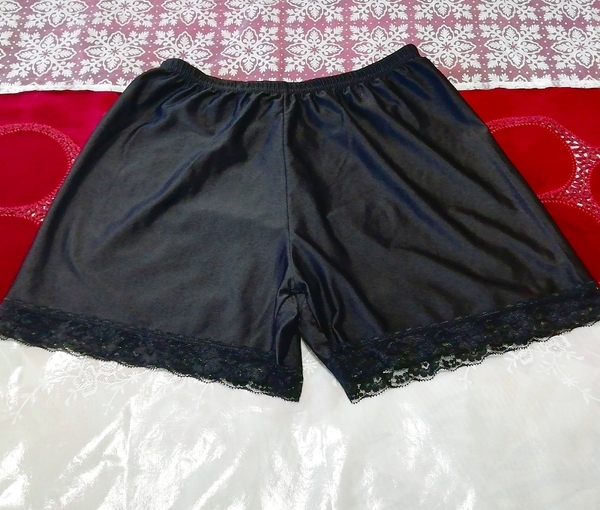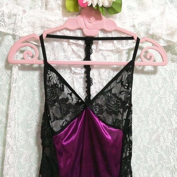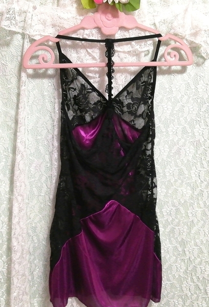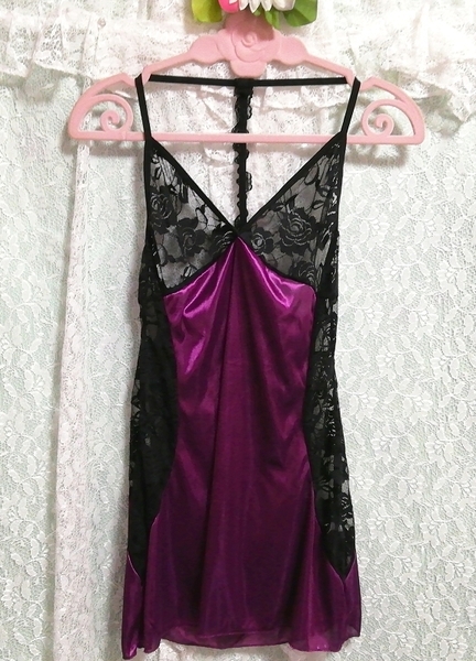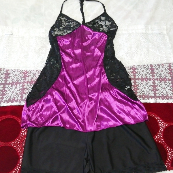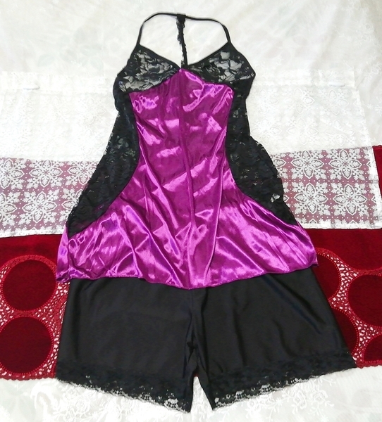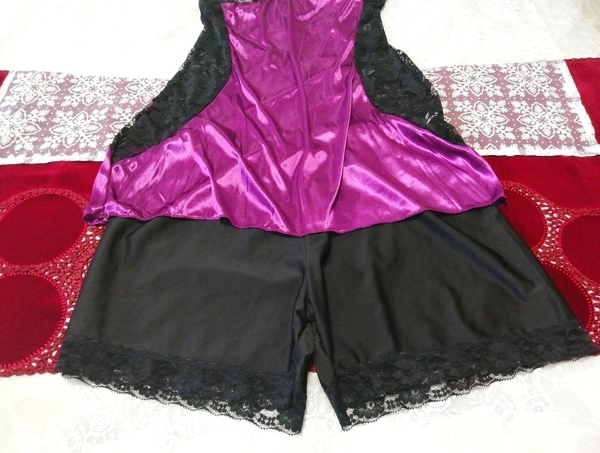 紫サテン黒レースキャミソール ネグリジェ ナイトウェア ショートパンツ 2P Purple satin black lace camisole negligee nightwear shorts